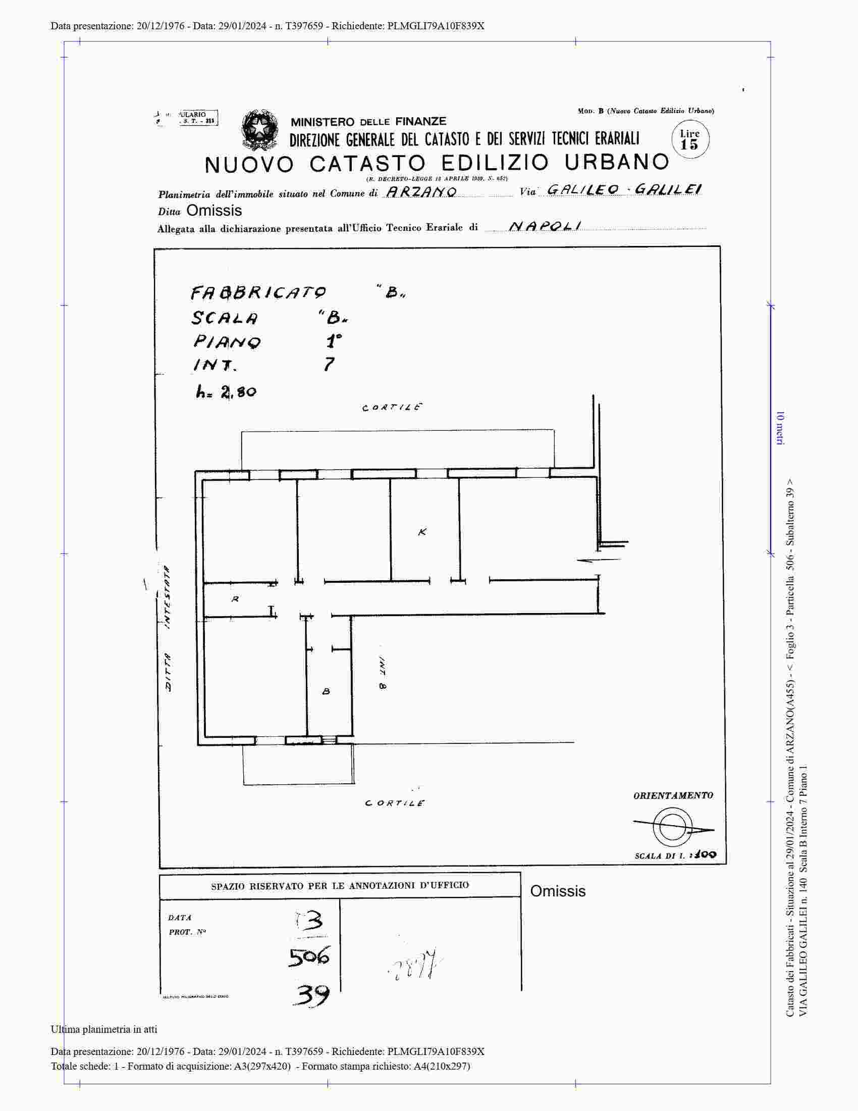 Quota di 1/1 di proprietà di appartamento identificato al catasto fabbricati del comune di Arzano (NA) alla località Selvitelle, con accesso dalla Via Galileo Galilei 140 – L’u.i. sub.39 (interno 7 o scala B) ad uso residenziale è posta al piano primo e prende accesso dal corpo scala condominiale, internamente si compone di ambienti quali: soggiorno, cucina, bagno, due camere, studio, inoltre, due balconi esposti rispettivamente ad Ovest ed Est