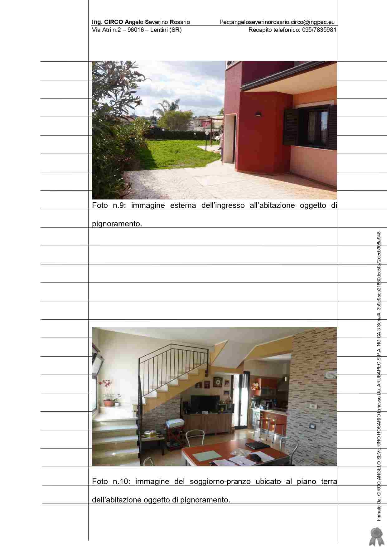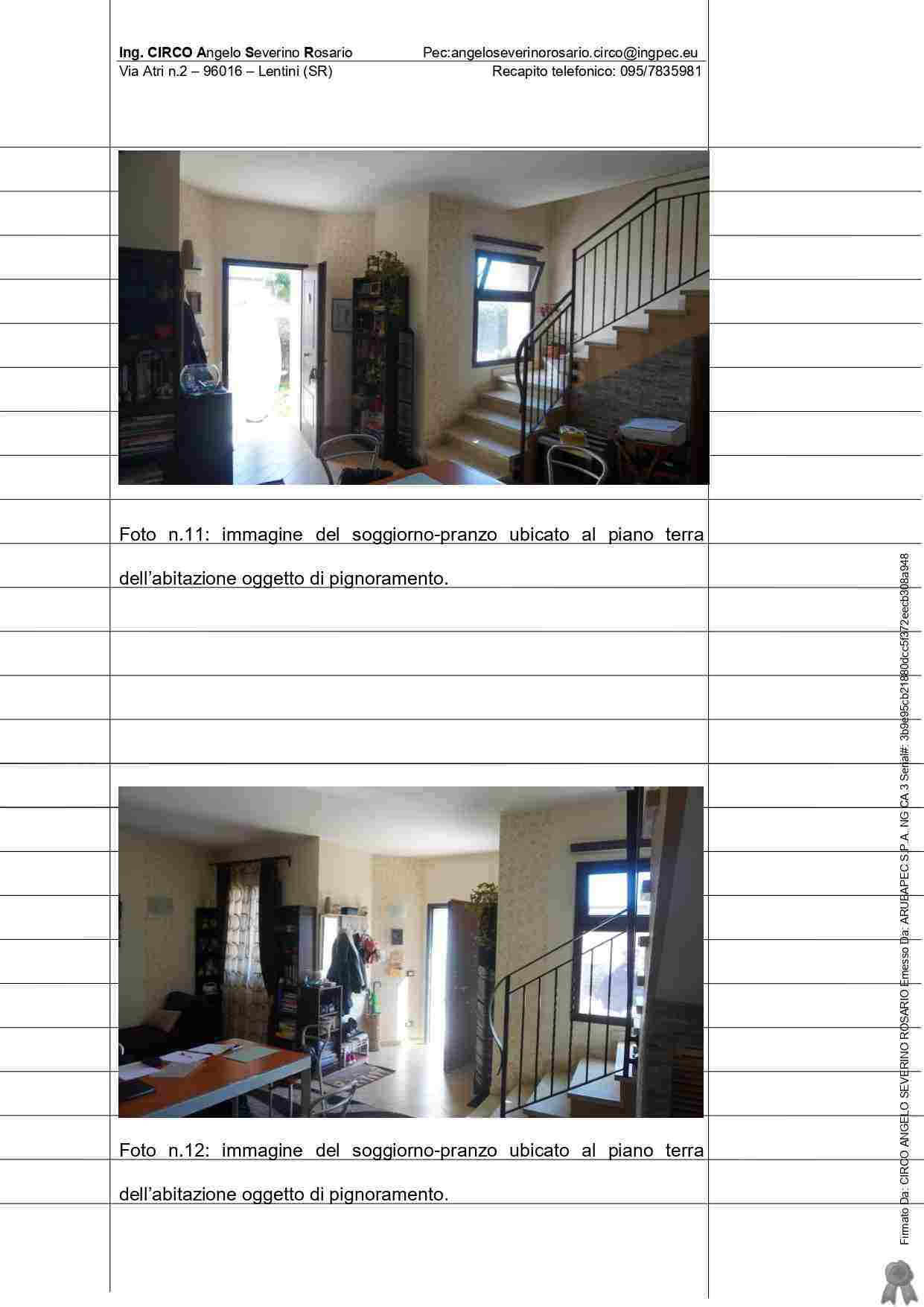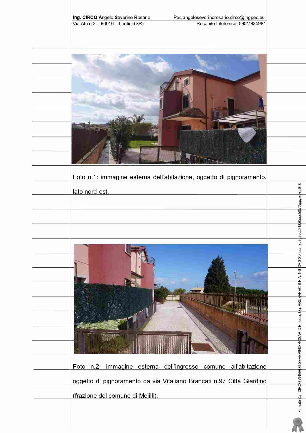 IMMOBILE SITO NEL Comune di MELILLI VIA BRANCATI s.n. (con accesso dal civico 97) abitazione costituita dai piani terra, primo e secondo – quest’ultimo rappresentato da un sottotetto con annesso bagno e terrazza a livello di proprietà esclusiva censito al Catasto dei fabbricati del comune di Melilli al foglio n.86, particella 1724, sub.6, zona censuaria 1, categ. A/2, classe 3, vani catastali 6,5,Totale: 154 mq, escluse aree scoperte 151 mq, rendita catastale pari a 637,82 euro via Brancati Sn., piano T-1-2