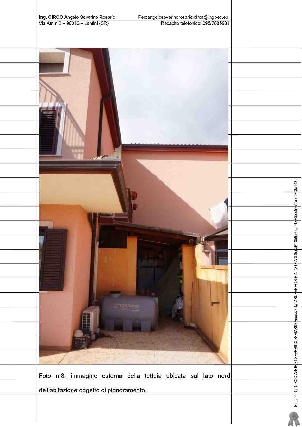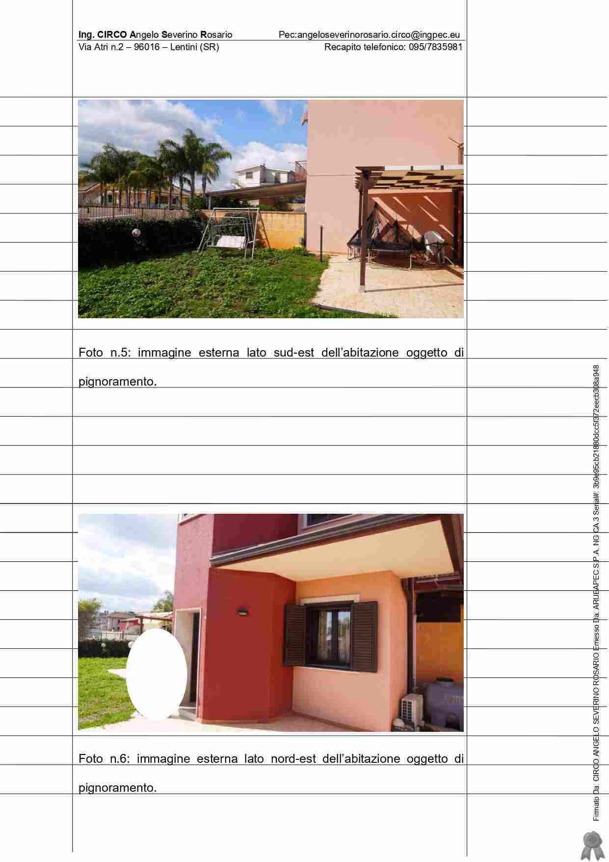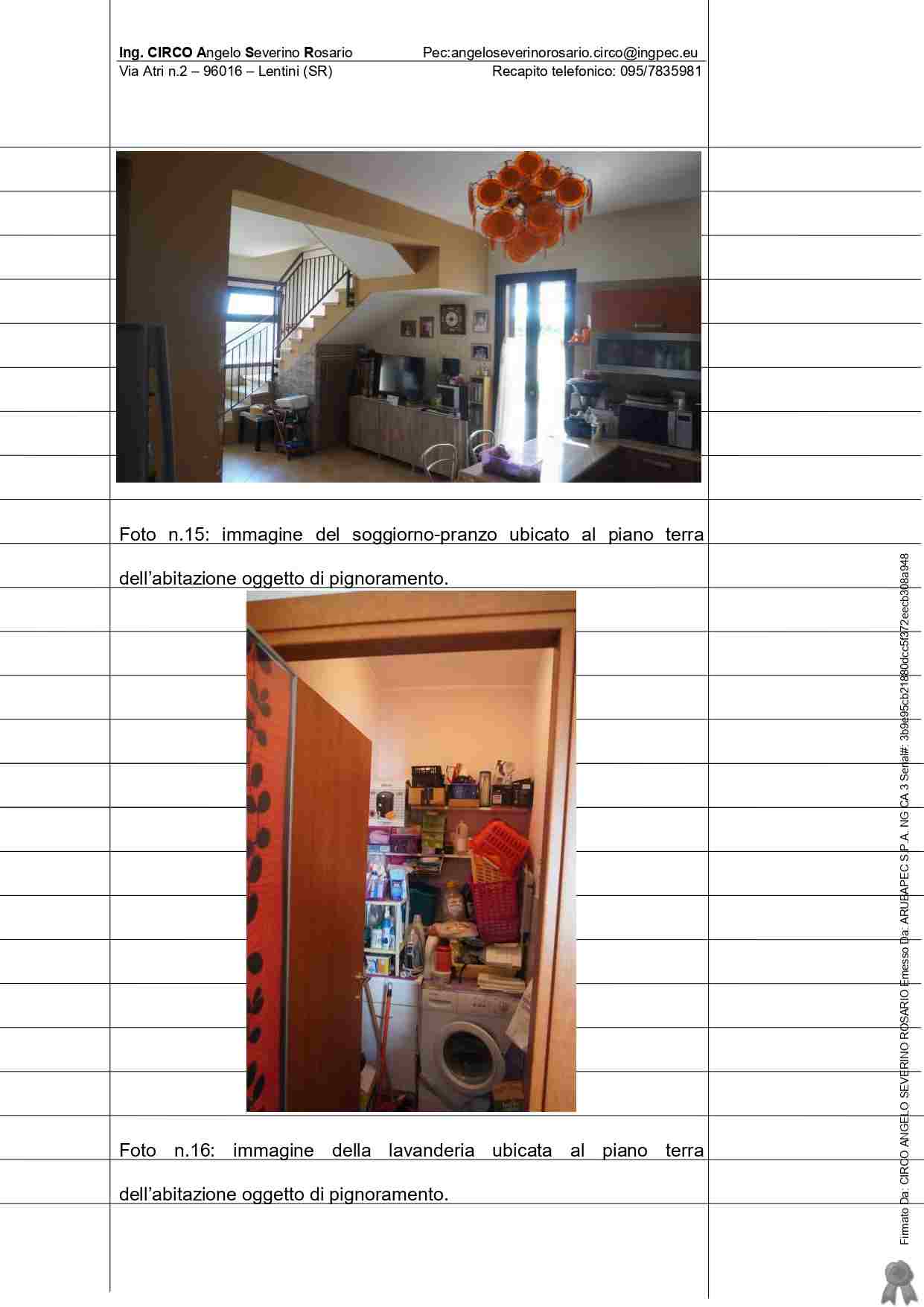 IMMOBILE SITO NEL Comune di MELILLI VIA BRANCATI s.n. (con accesso dal civico 97) abitazione costituita dai piani terra, primo e secondo – quest’ultimo rappresentato da un sottotetto con annesso bagno e terrazza a livello di proprietà esclusiva censito al Catasto dei fabbricati del comune di Melilli al foglio n.86, particella 1724, sub.6, zona censuaria 1, categ. A/2, classe 3, vani catastali 6,5,Totale: 154 mq, escluse aree scoperte 151 mq, rendita catastale pari a 637,82 euro via Brancati Sn., piano T-1-2