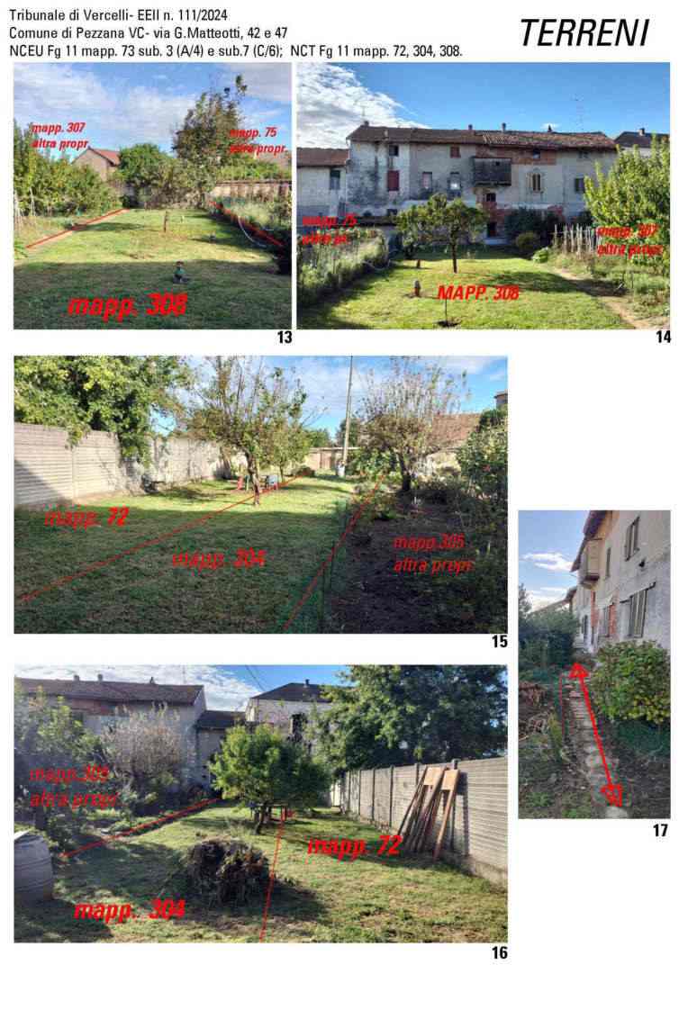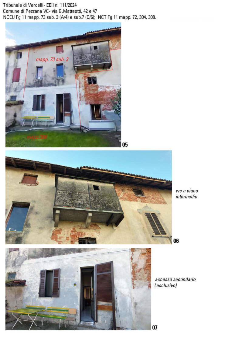 Porzione di fabbricato ad uso abitativo di matrice rurale elevato a tre piani fuori terra, autorimessa insistente su area comune prospiciente il fabbricato principale, mq 525 di terreno agricolo adibito a prato/giardino di cui mq 210 limitrofi alla parte retrostante il fabbricato e mq 315 in corpo staccato.