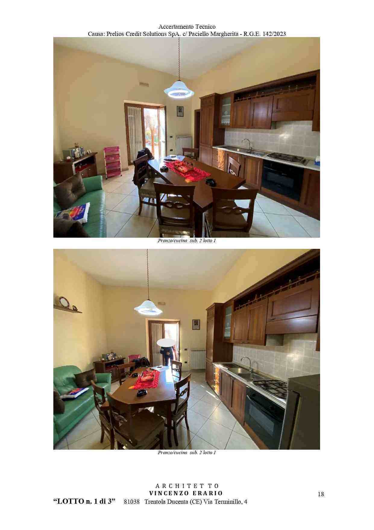 LOTTO UNO (identificato in perizia come LOTTO UNO): Piena ed intera proprietà di unità immobiliare facente parte di un complesso immobiliare ubicato nel Comune di Frignano (CE) alla Via Cesare Battisti n. 18, composta da: una cucina/pranzo, da un corridoio 1 e un corridoio 2 che servono un wc, un soggiorno, una camera da letto e l’altezza dei vani al piano terra è pari a 3,50 ml; il tutto per una superficie calpestabile totale di alloggio di 68,05 mq ed una superficie non residenziale di 85,04 mq