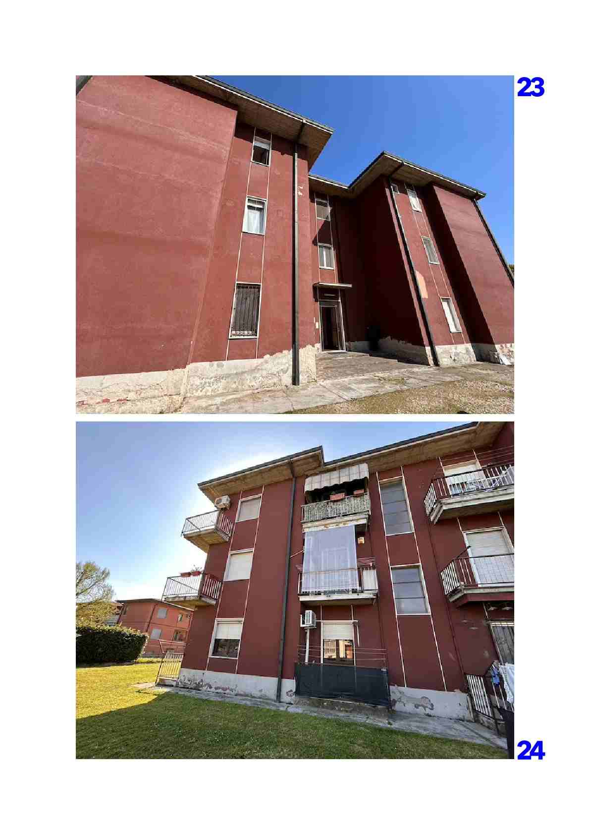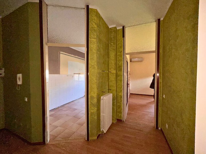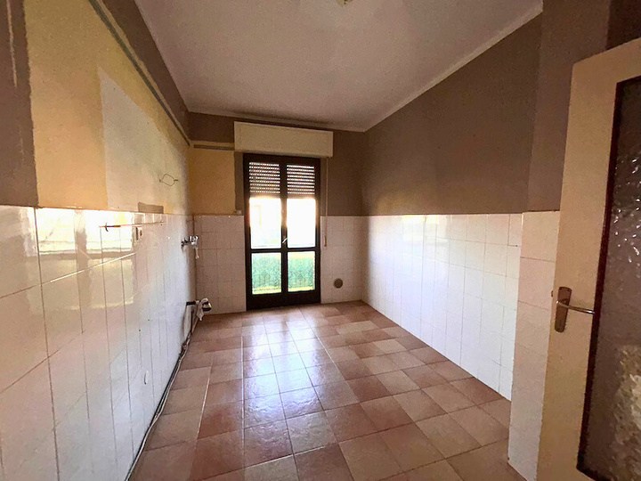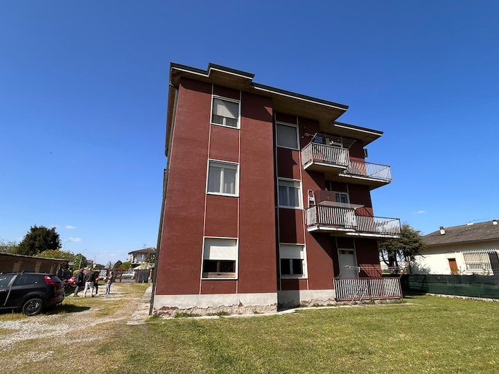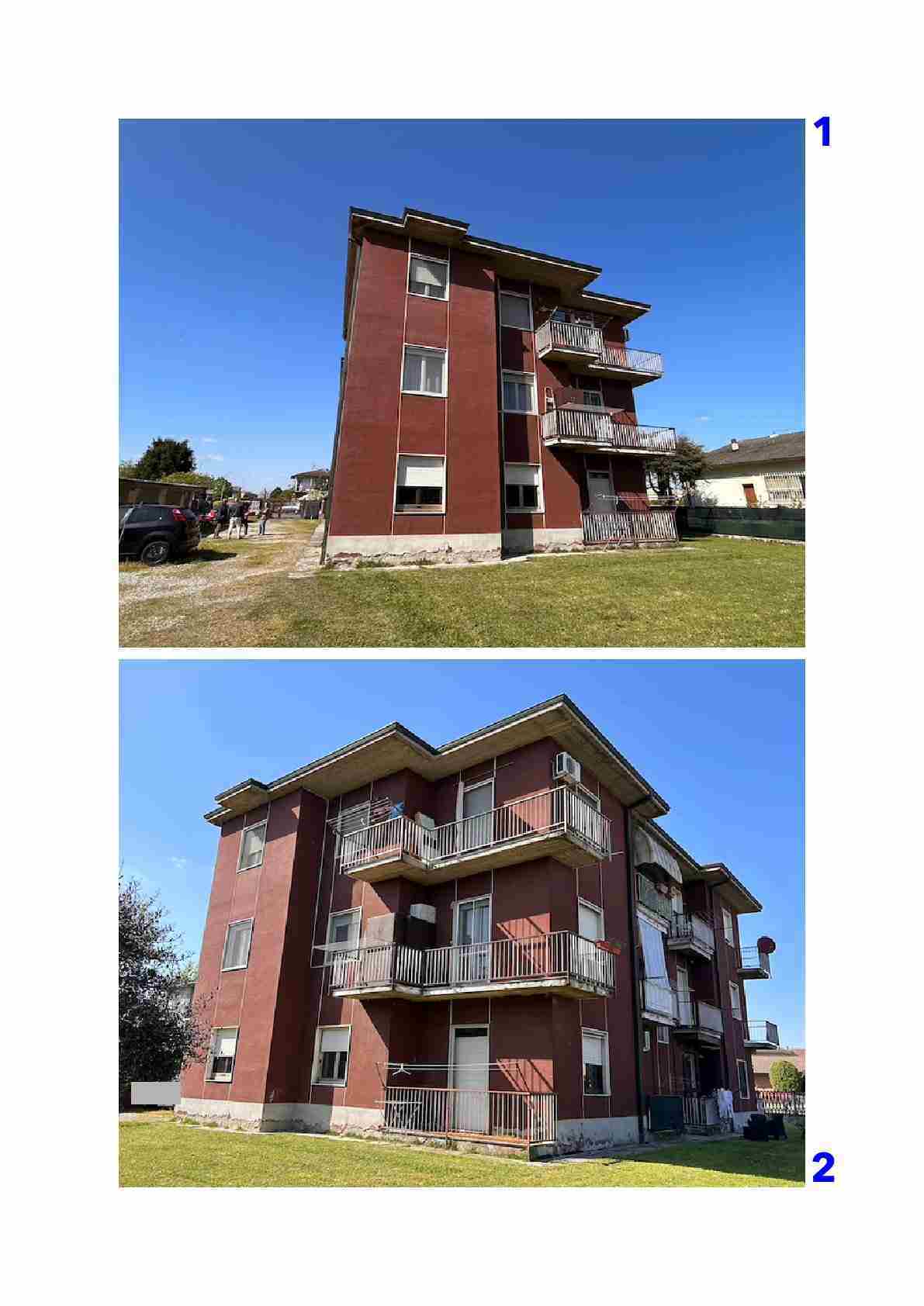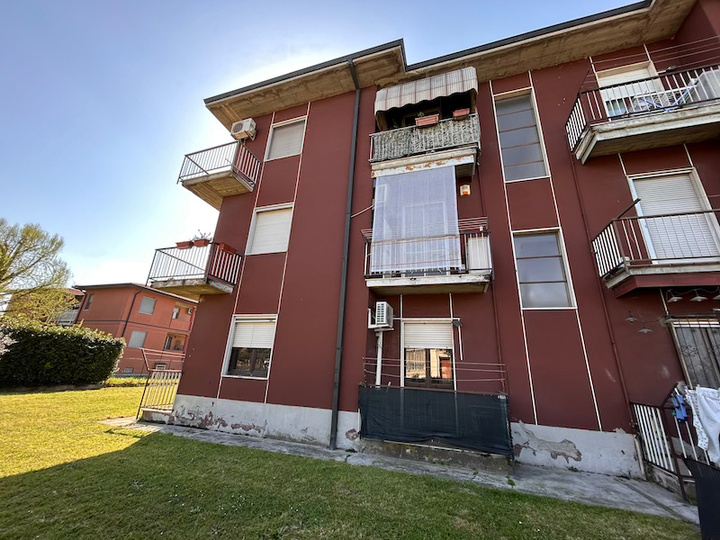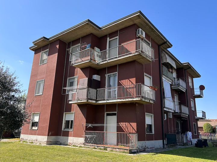 Appartamento composto da ingresso, cucina, soggiorno, disimpegno, due camere, bagno, ripostiglio, due balconi oltre a autorimessa esterna situato all'interno di una palazzina condominiale di tre piani fuori terra complessivi, priva di ascensore, circondata da ampio giardino
