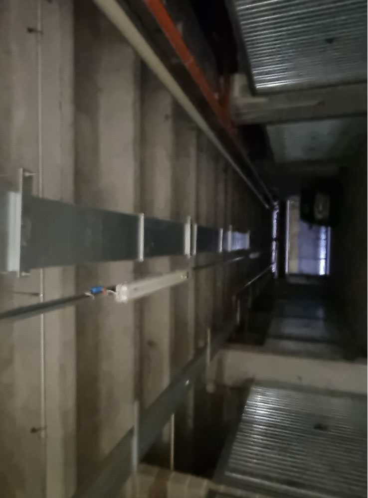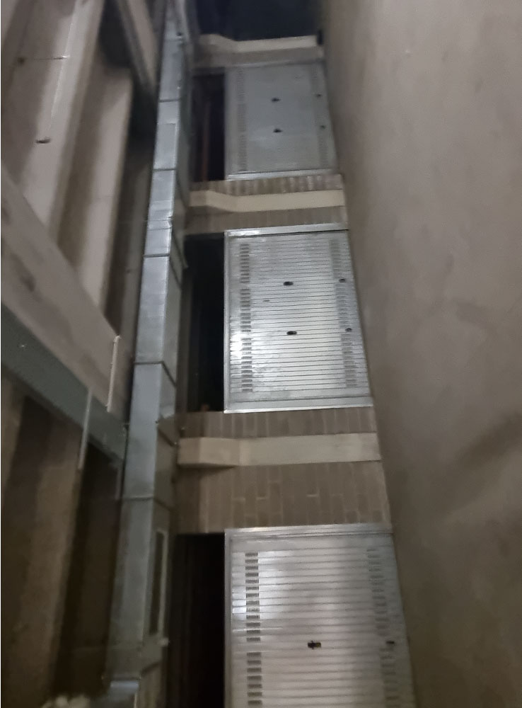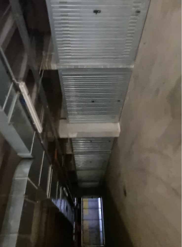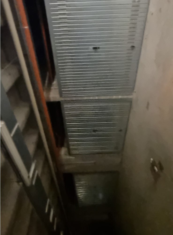 Proprietà esclusiva di n. 28 autorimesse poste al piano interrato, dotate di porta basculante in acciaio zincato carente di fascia di chiusura superiore. L'accesso avviene dal piano strada tramite uno scivolo d'ingresso oppure tramite scala interna o ascensore. Al momento della redazione della perizia, gli accessi carrali sono interdetti in quanto non c'è agibilità per mancanza di CPI. Il tutto oltre alla proporzionale quota delle parti ed enti comuni.