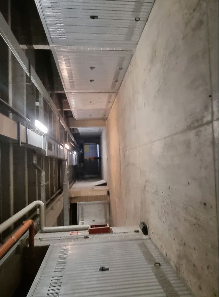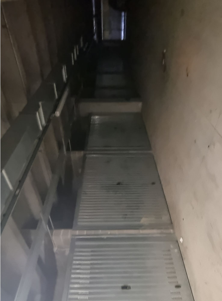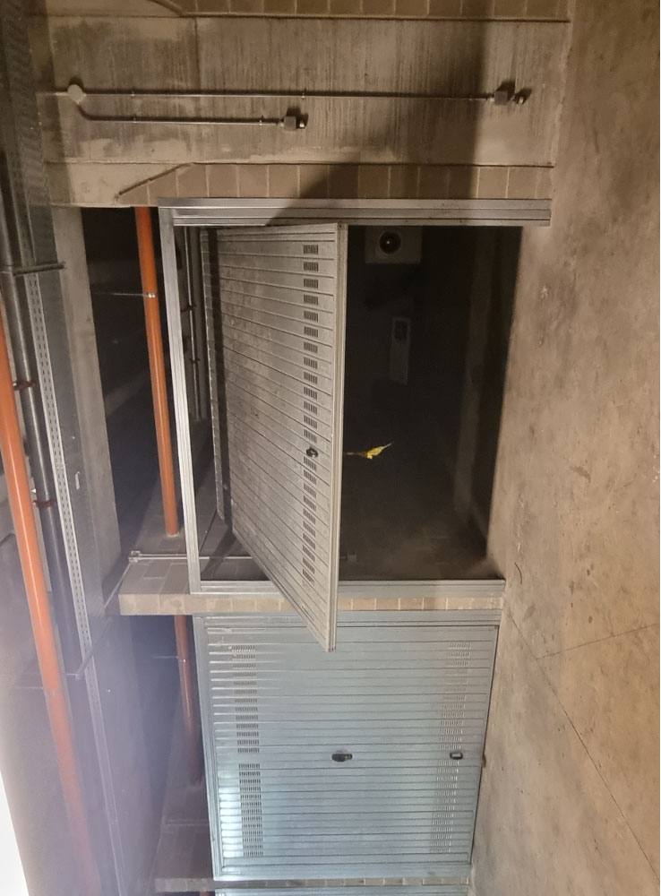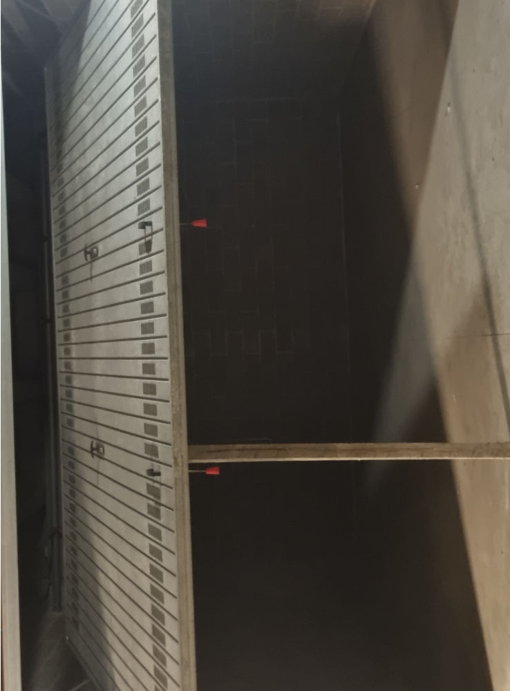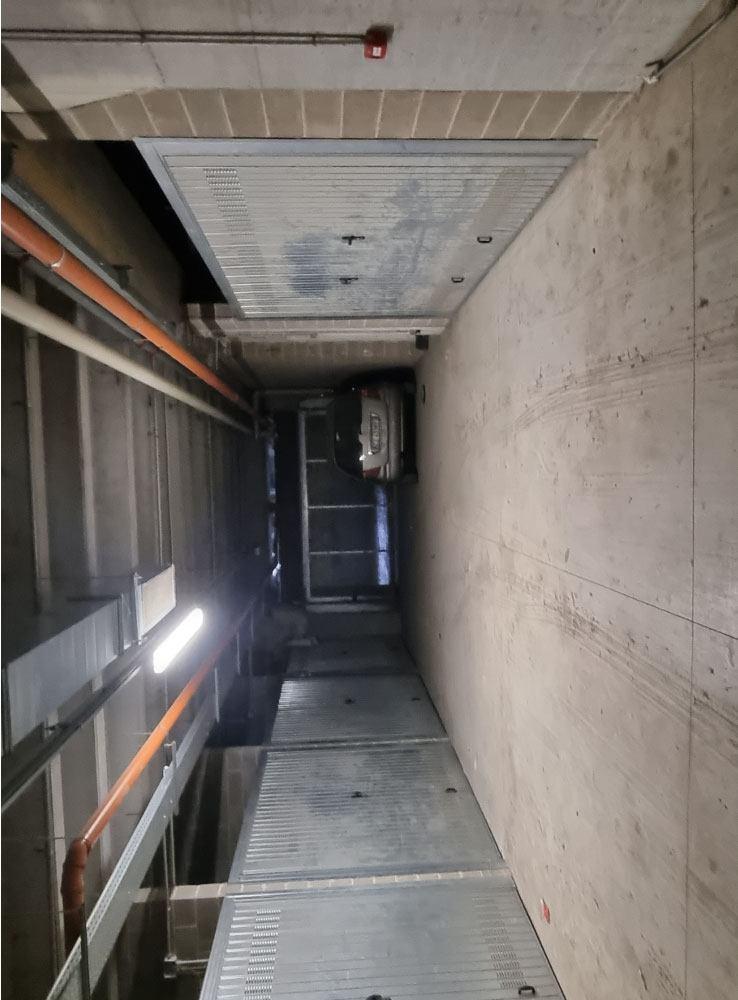 Proprietà esclusiva di n. 28 autorimesse poste al piano interrato, dotate di porta basculante in acciaio zincato carente di fascia di chiusura superiore. L'accesso avviene dal piano strada tramite uno scivolo d'ingresso oppure tramite scala interna o ascensore. Al momento della redazione della perizia, gli accessi carrali sono interdetti in quanto non c'è agibilità per mancanza di CPI. Il tutto oltre alla proporzionale quota delle parti ed enti comuni.
