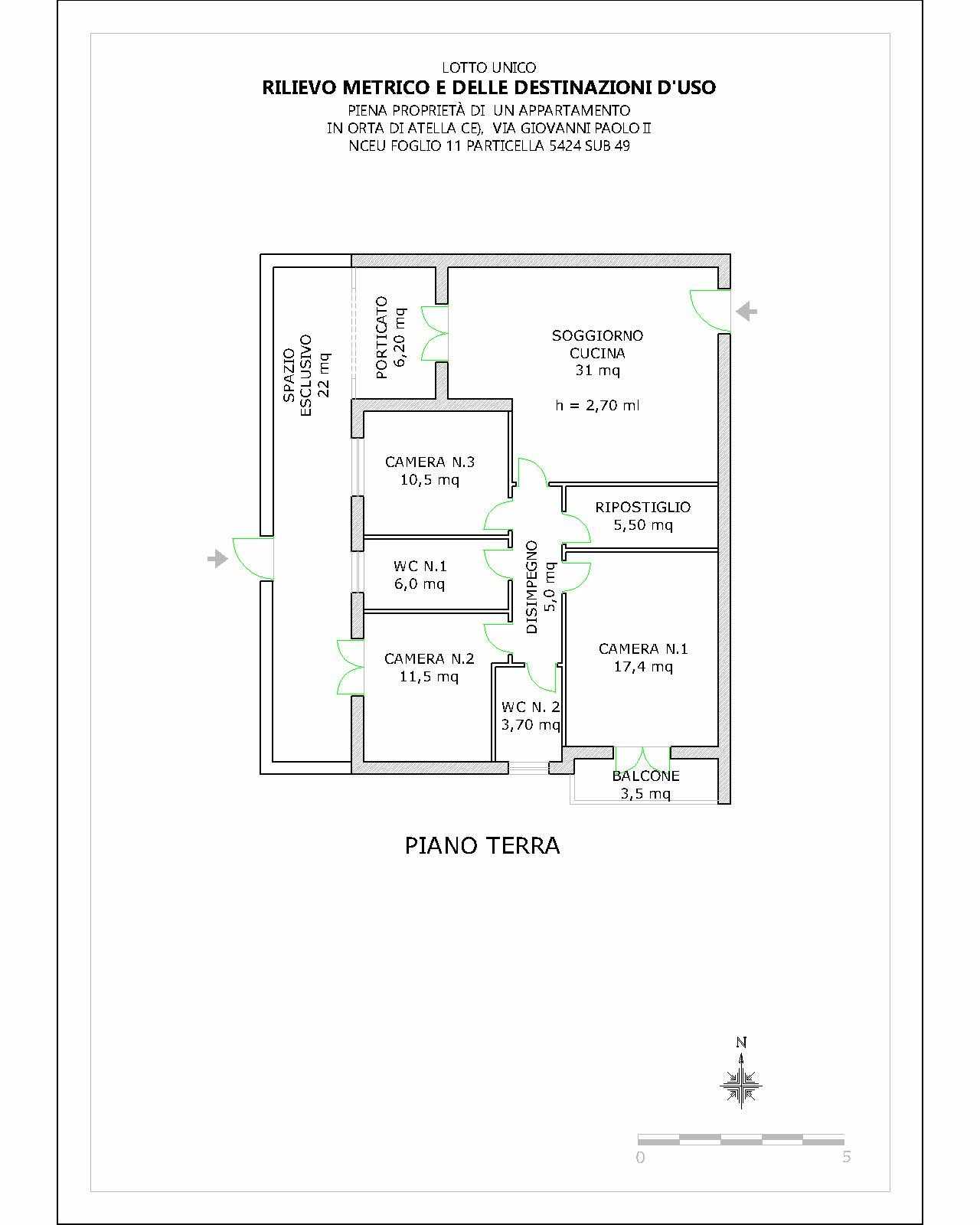 Piena ed intera proprietà di un appartamento nel di Orta di Atella (Ce) alla via Giovanni Paolo II nn. 13/15, Condominio “Parco Fabulae”, riportato in catasto fabbricati di detto Comune al foglio 11, part. 5424, sub 49, cat. A2, consistenza 5,5 vani, scala C, int. 3. piano terra, Rend. Catastale Euro 426,08.Il tutto come meglio precisato, descritto e valutato dall’Arch. Antonia Giovenale con la CTU depositata in data 04.07.2025 titolo e perizia cui il presente avviso si riporta e fa completo riferimento.