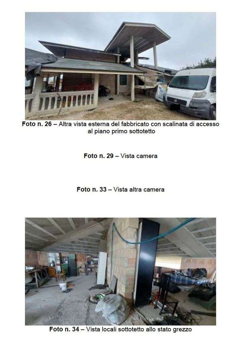 Fabbricato unifamiliare composto da piano terra e primo sottotetto, collegati da scala esterna. Piano terra composto da ingresso-soggiorno, cucina, disimpegno, tre camere, due bagni ed ampio porticato con scala esterna che conduce al piano sottotetto allo stato grezzo. L'immobile ha accesso da corte comune. In adiacenza al fabbricato è presente un corpo di fabbrica indipendente di circa mq. 36 adibito a garage, privo di titolo abilitativo.