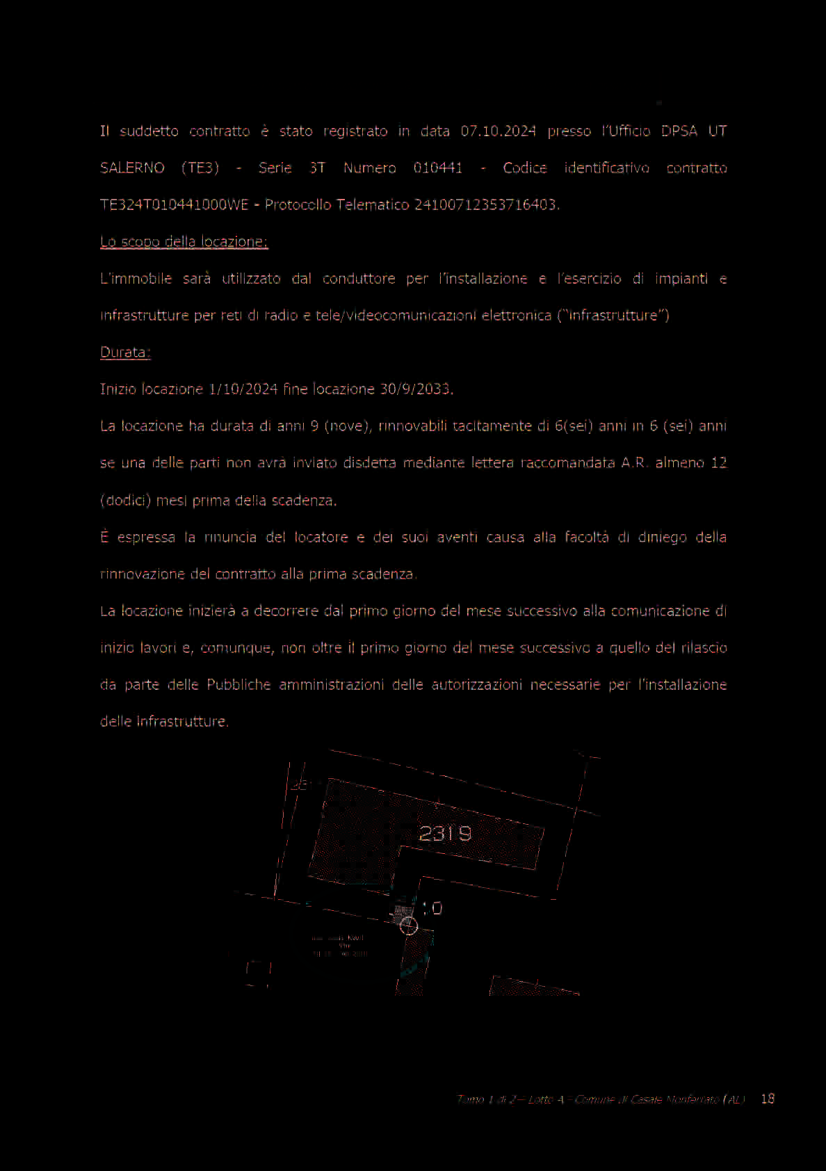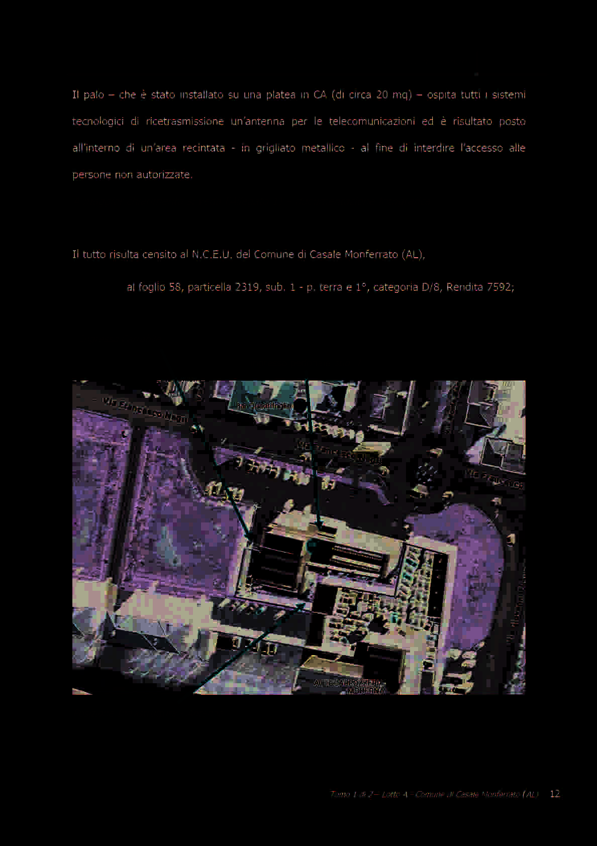 Piena proprietà dell’immobile commerciale sito in Casale Monferrato (AL), alla Via Francesco Negri n. 29-33-35, così identificato al N.C.E.U. del predetto comune: foglio 58, particella 2319, sub. 1, categoria D/8 e rendita 7.592,00. L’immobile è costituito da un capannone prefabbricato, di recente realizzazione, con destinazione di commercio all’ingrosso e al dettaglio di generi alimentari freschi conservati e surgelati ed in particolare frutta e verdura, e dalle circostanti aree ve