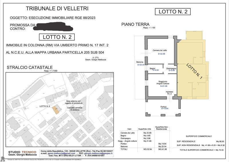 Piena proprietà di appartamento sito in Colonna (RM) - Via Umberto Primo n. 17 – Int. 2, piano Terra. Quota di proprietà di 1/4 pro indiviso del terreno circostante l’immobile, qualità Frutteto.