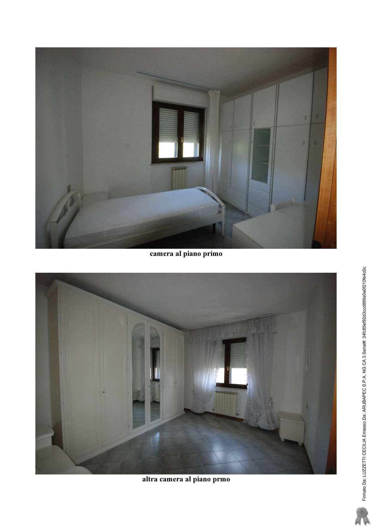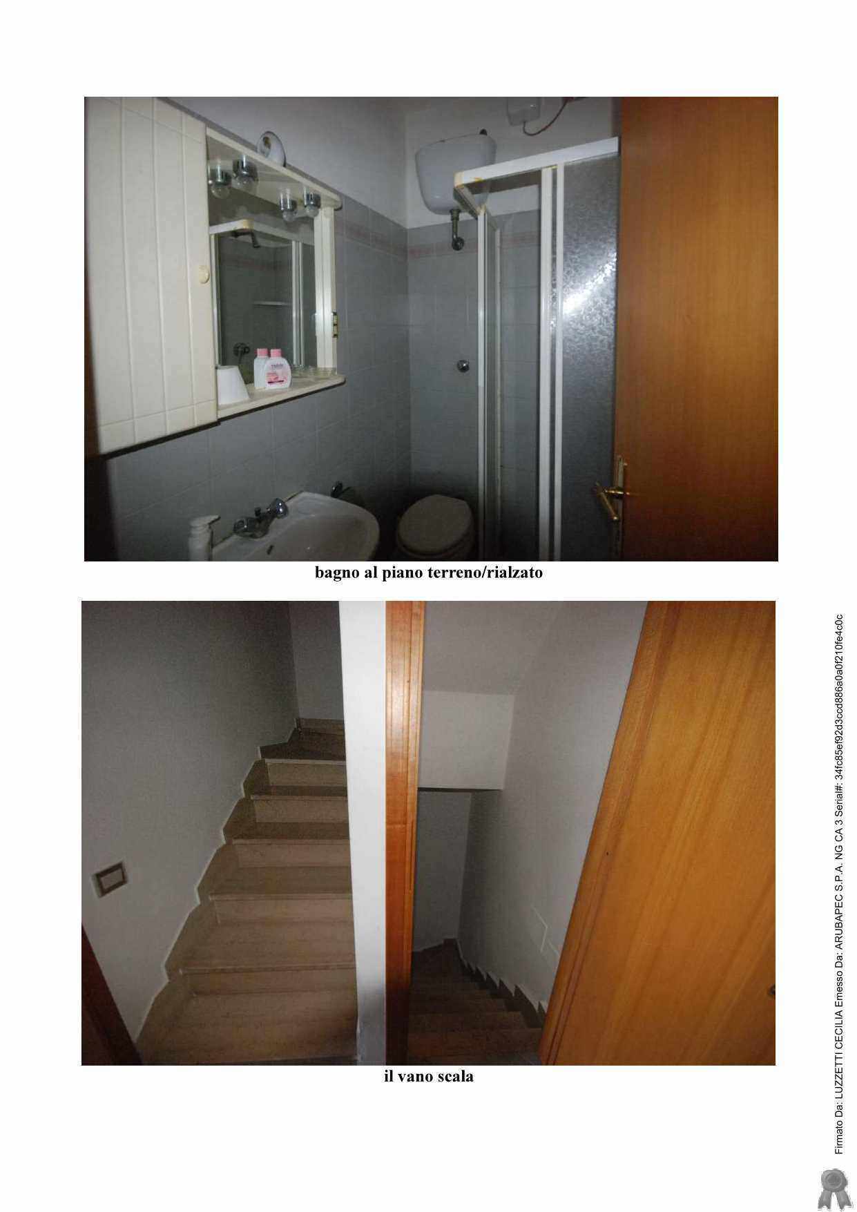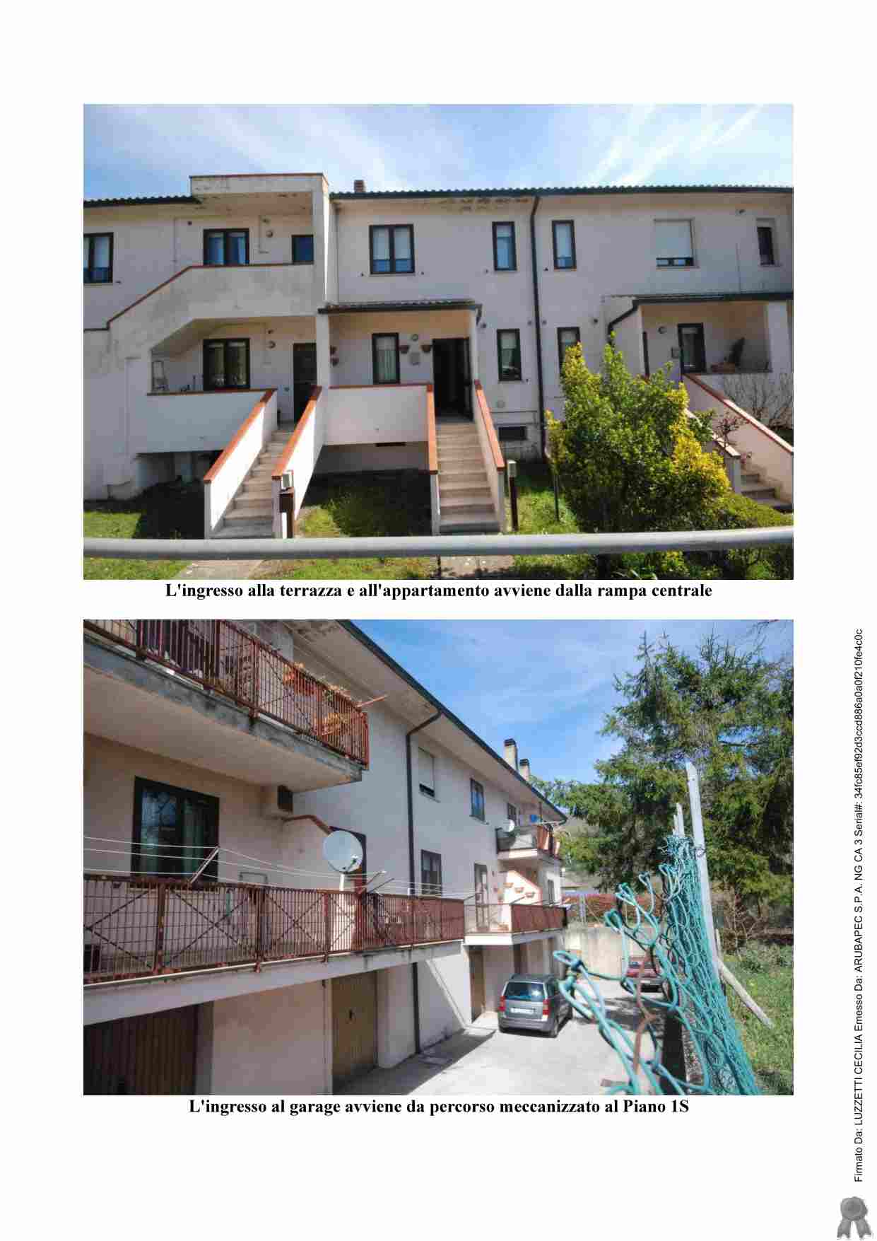 Appartamento civile abitazione e un garage. Al piano di ingresso si ha il pranzo, cucina, soggiorno con terrazza, vano arredato a camera con accesso al soggiorno e un bagno; al piano superiore si trovano due camere e un bagno; al piano inferiore si trova una cantina, un ripostiglio attrezzato come cucina, garage