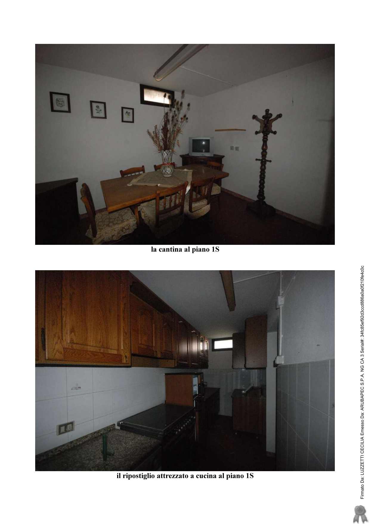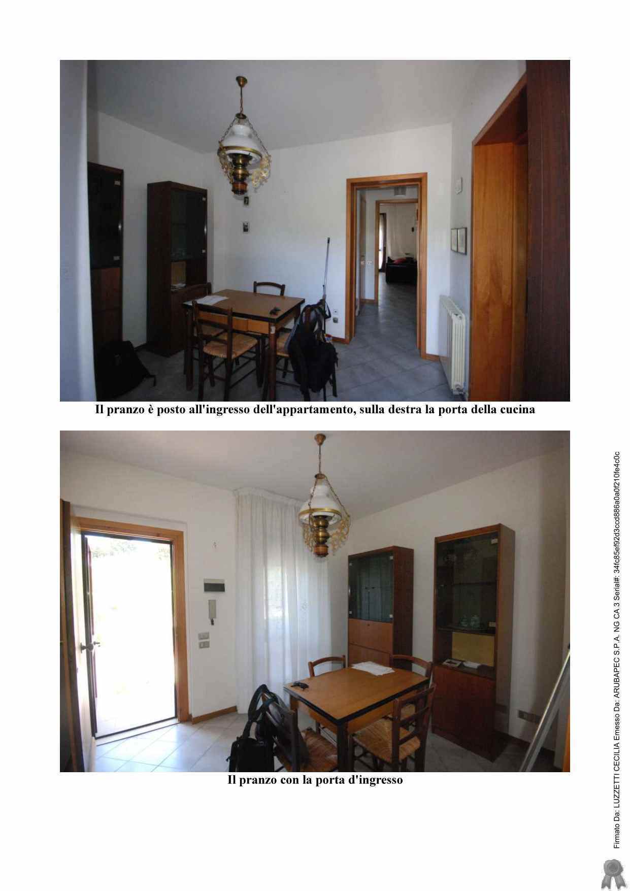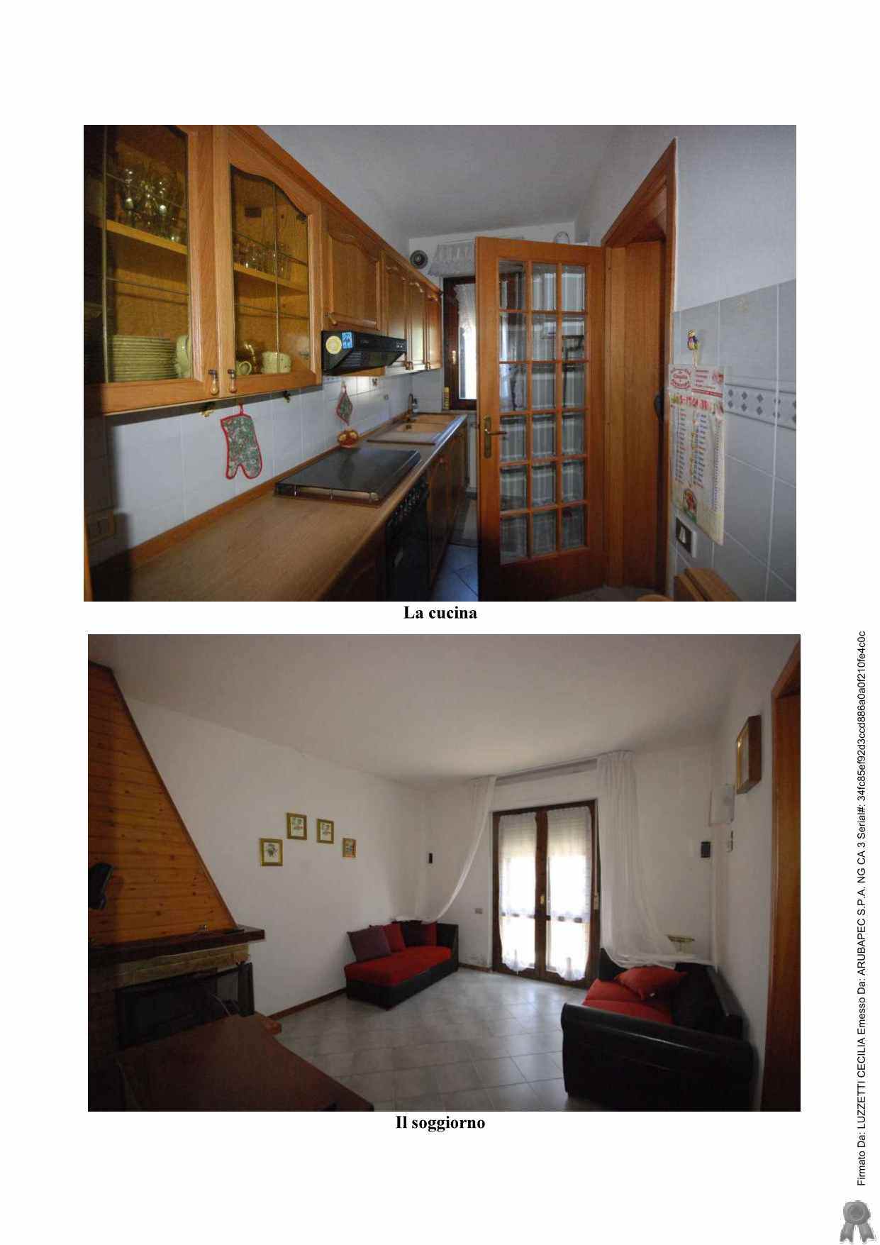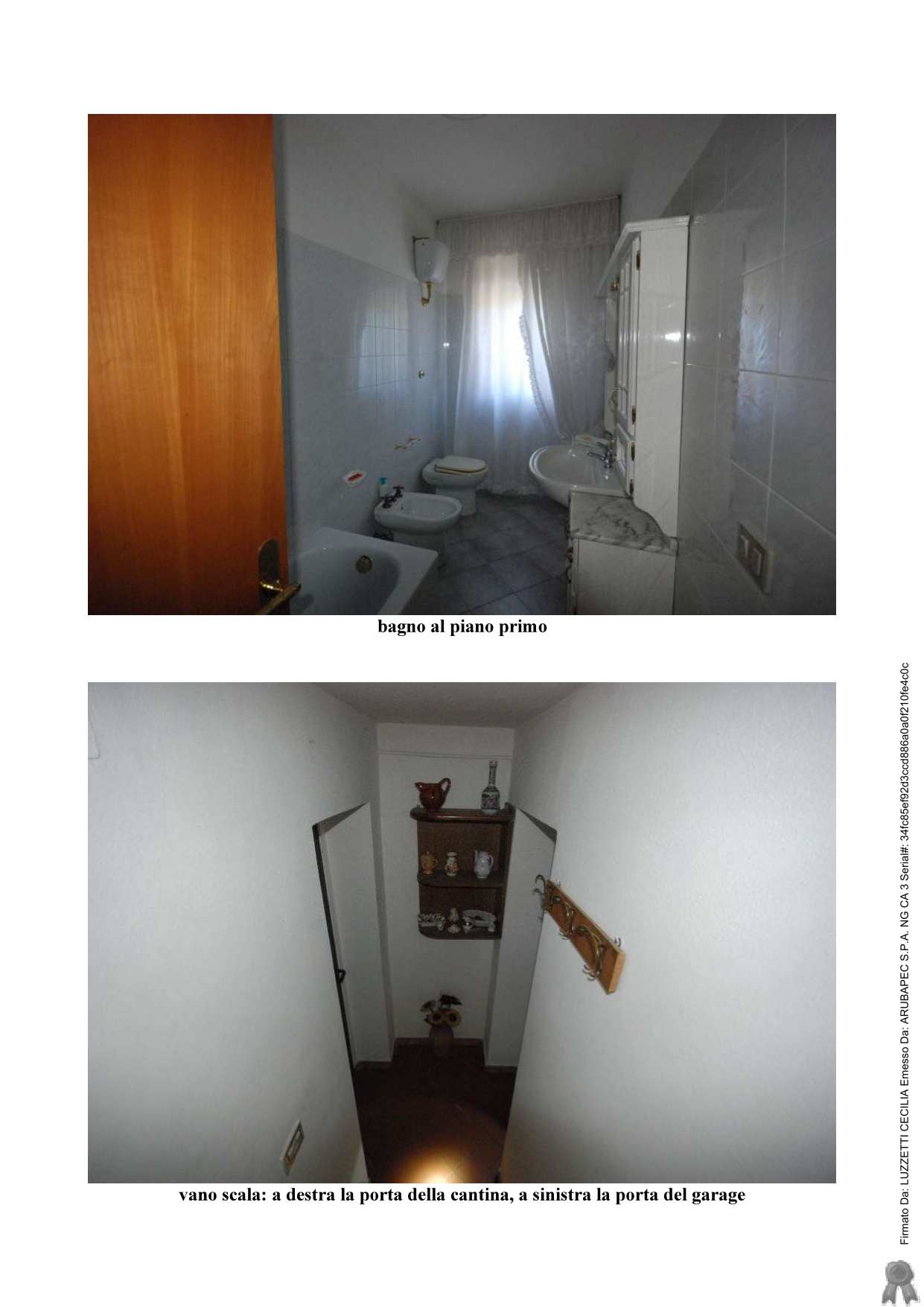 Appartamento civile abitazione e un garage. Al piano di ingresso si ha il pranzo, cucina, soggiorno con terrazza, vano arredato a camera con accesso al soggiorno e un bagno; al piano superiore si trovano due camere e un bagno; al piano inferiore si trova una cantina, un ripostiglio attrezzato come cucina, garage