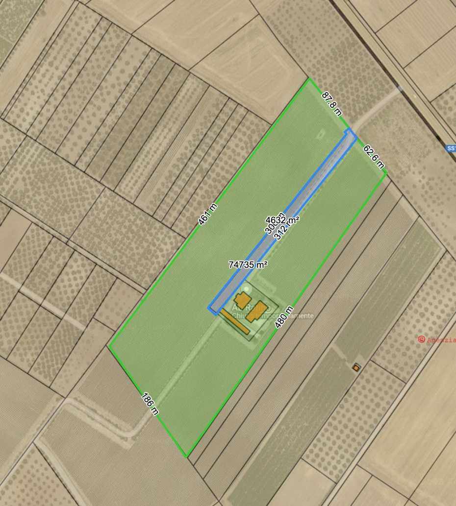 Complesso immobiliare con accesso principale dalla Strada Statale 16, costituito da tre fabbricati e terreni (strada di accesso): (a) villa unifamiliare a due piani con giardino, della superficie commerciale di 411,04 mq; (b) fabbricato deposito con una tettoia, uffici e magazzino, della superficie commerciale di 252,99 mq; (c) fabbricato uso deposito della superficie commerciale di 337,92 mq; (d) strada di accesso costituita dalla part. 527 al catasto terreni.