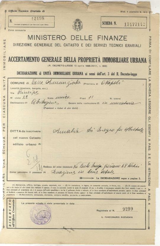 L’appartamento è situato nel Comune di Torre Annunziata (NA), in Via Rosselli n. 22, al primo piano di un edificio residenziale di due livelli fuori terra. L’unità, con superficie catastale di 138 mq e commerciale di circa 112 mq, è composta da tre vani principali, cucina, corridoio e bagno, con affacci su Via Rosselli, Vico A. Costa e corte interna.