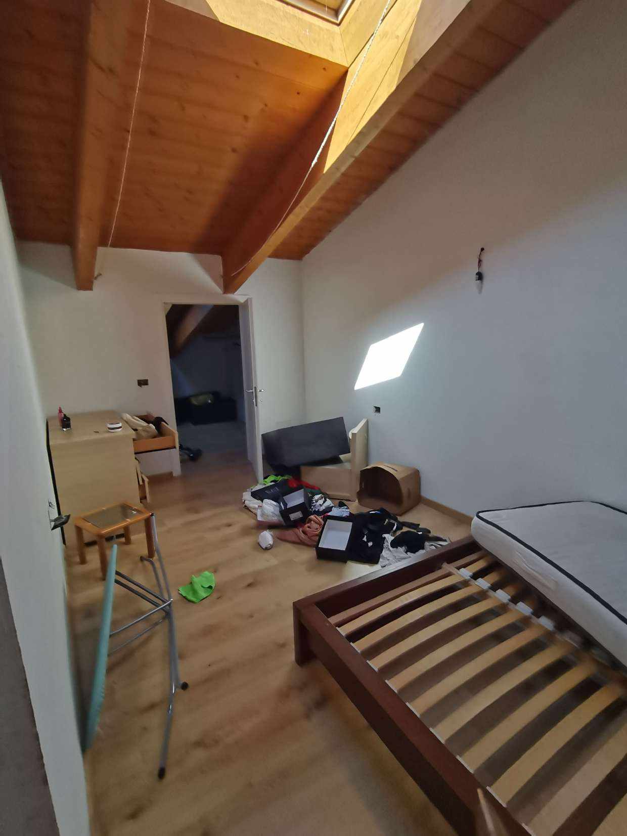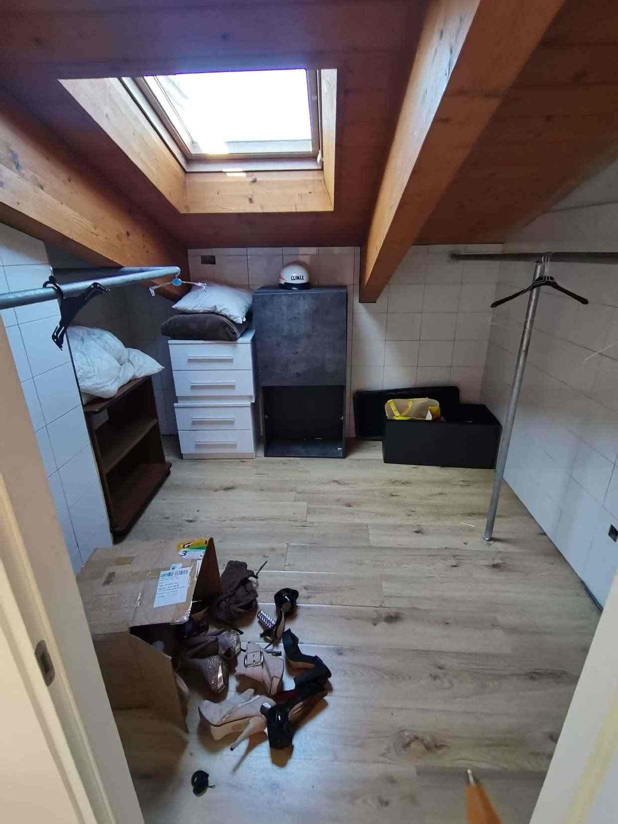 Appartamento della superficie commerciale di 117,15 mq posto al piano primo e secondo (sottotetto senza permanenza di persone) costituito: al piano primo da monolocale (soggiorno con angolo cottura), piccolo balconcino, disimpegno, bagno, scala interna che collega il piano primo sottotetto senza permanenza di persone suddiviso e usato abusivamente in due camere, bagno, e un locale cabina armadio con predisposizione impianti bagno, completano la proprietà una cantina ed un box