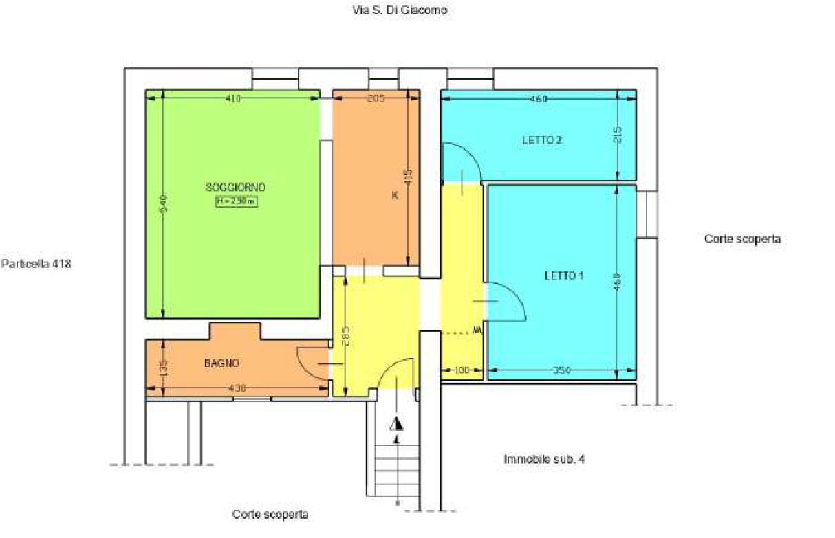 Piena ed intera proprietà di appartamento per civile abitazione ubicato in Giugliano in Campania (NA), alla Via Vincenzo Monti n. 5, p.no terra rialzato, interno 1; è composto da ingresso, soggiorno con cucina a vista, disimpegno, due camere, bagno.