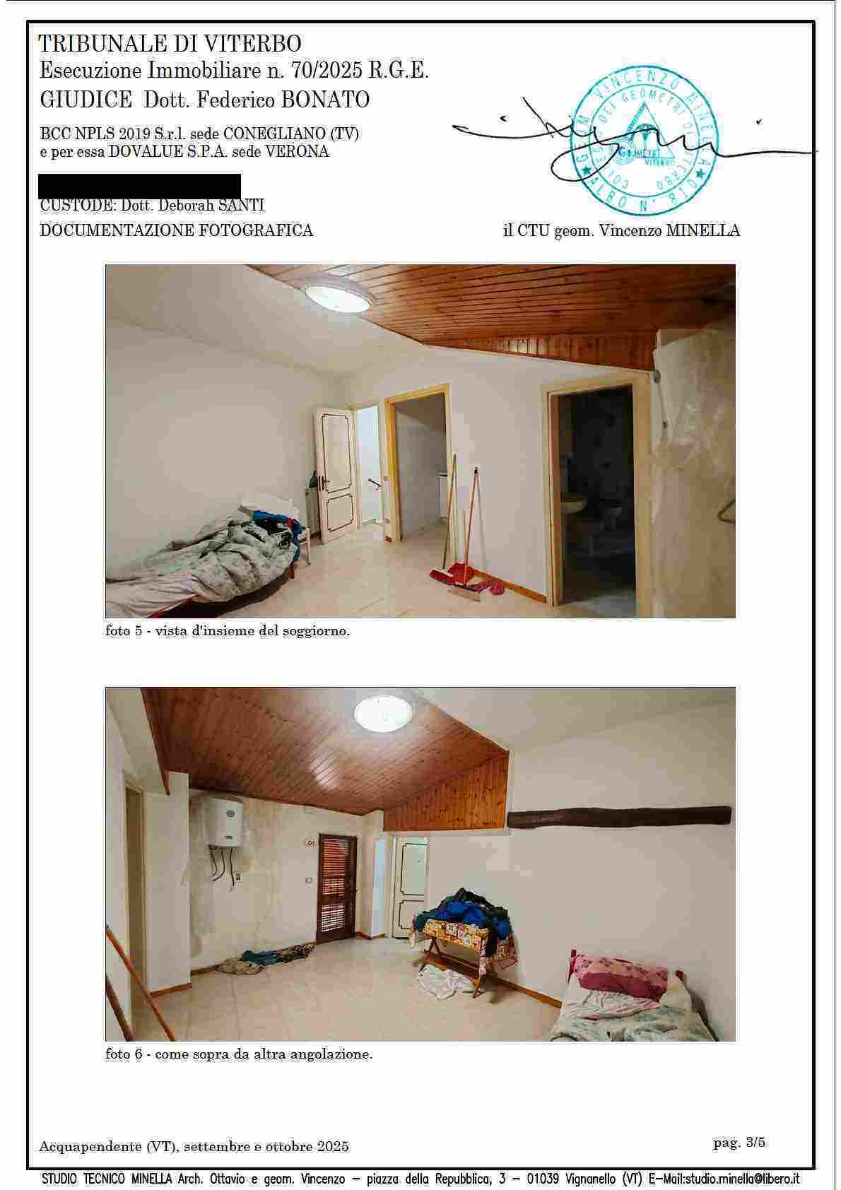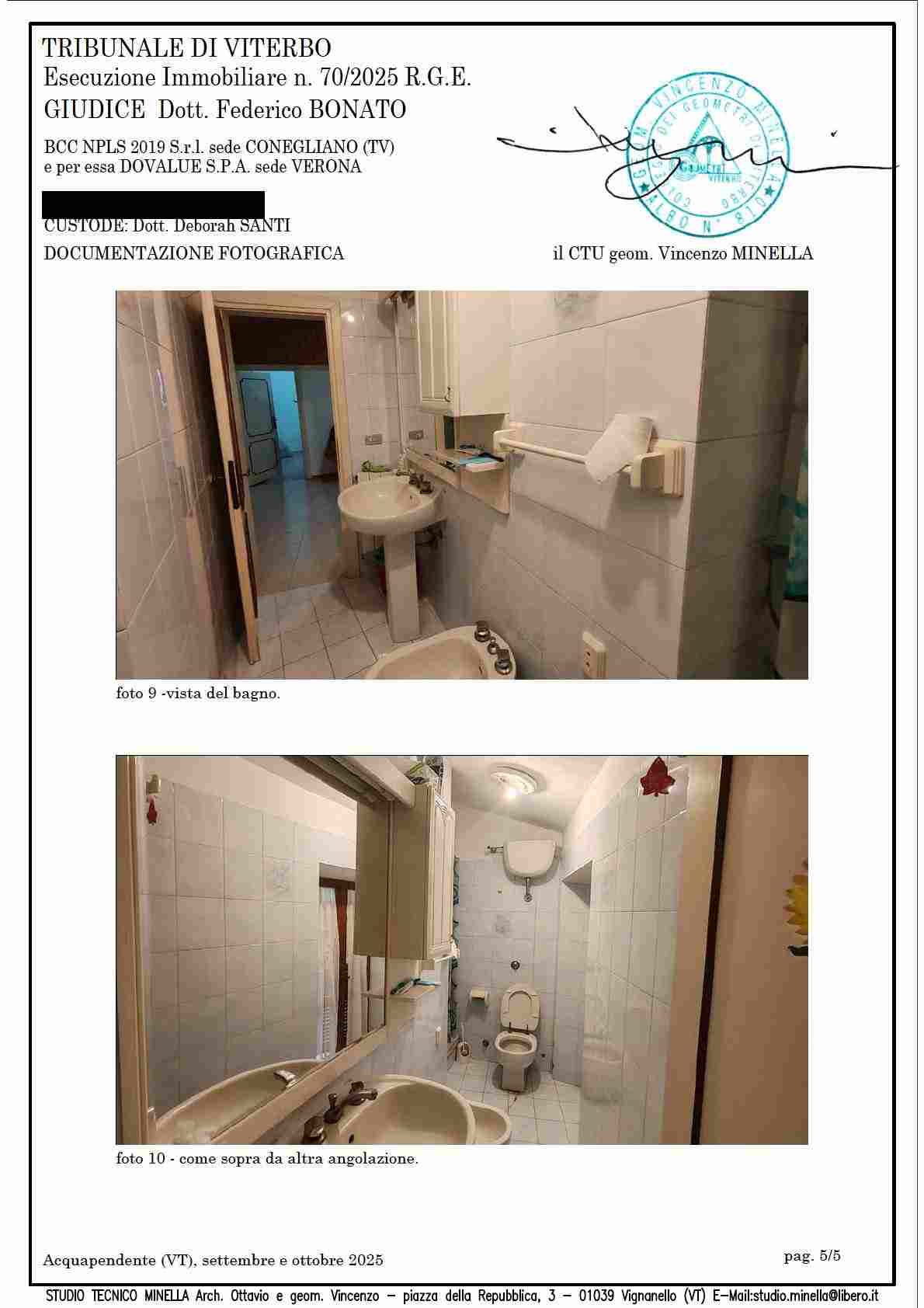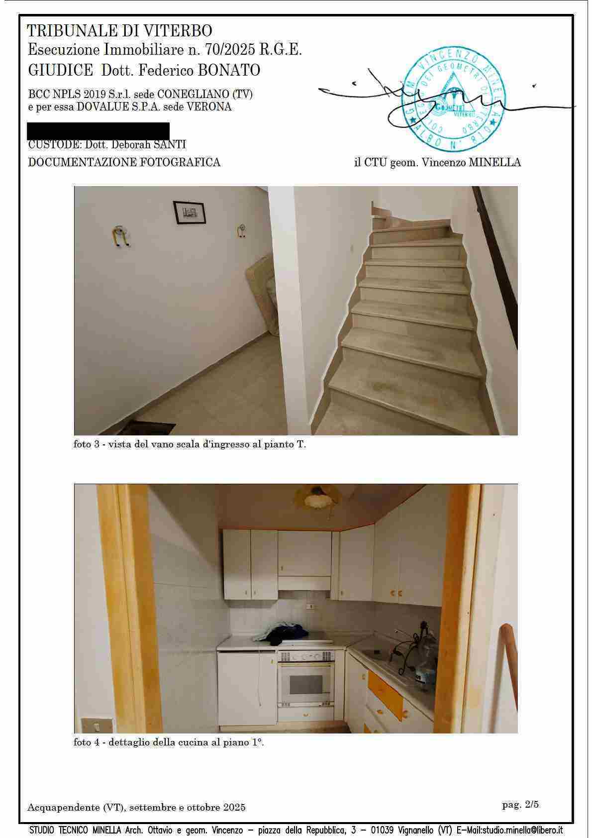 Piena proprietà per la quota dell’intero su abitazione ubicata nel centro storico del Comune di Acquapendente (VT) Via Maidalchini n. 39, piani T e 1, con superficie utile interna abitabile di mq. 44,95. Identificata al NCEU del ridetto Comune al foglio 55 p.lla 192 sub 5, categ. A/4, cl. 1, consistenza vani 4,5, rendita euro 158,04.Stato detentivo del bene: occupato dal debitore
