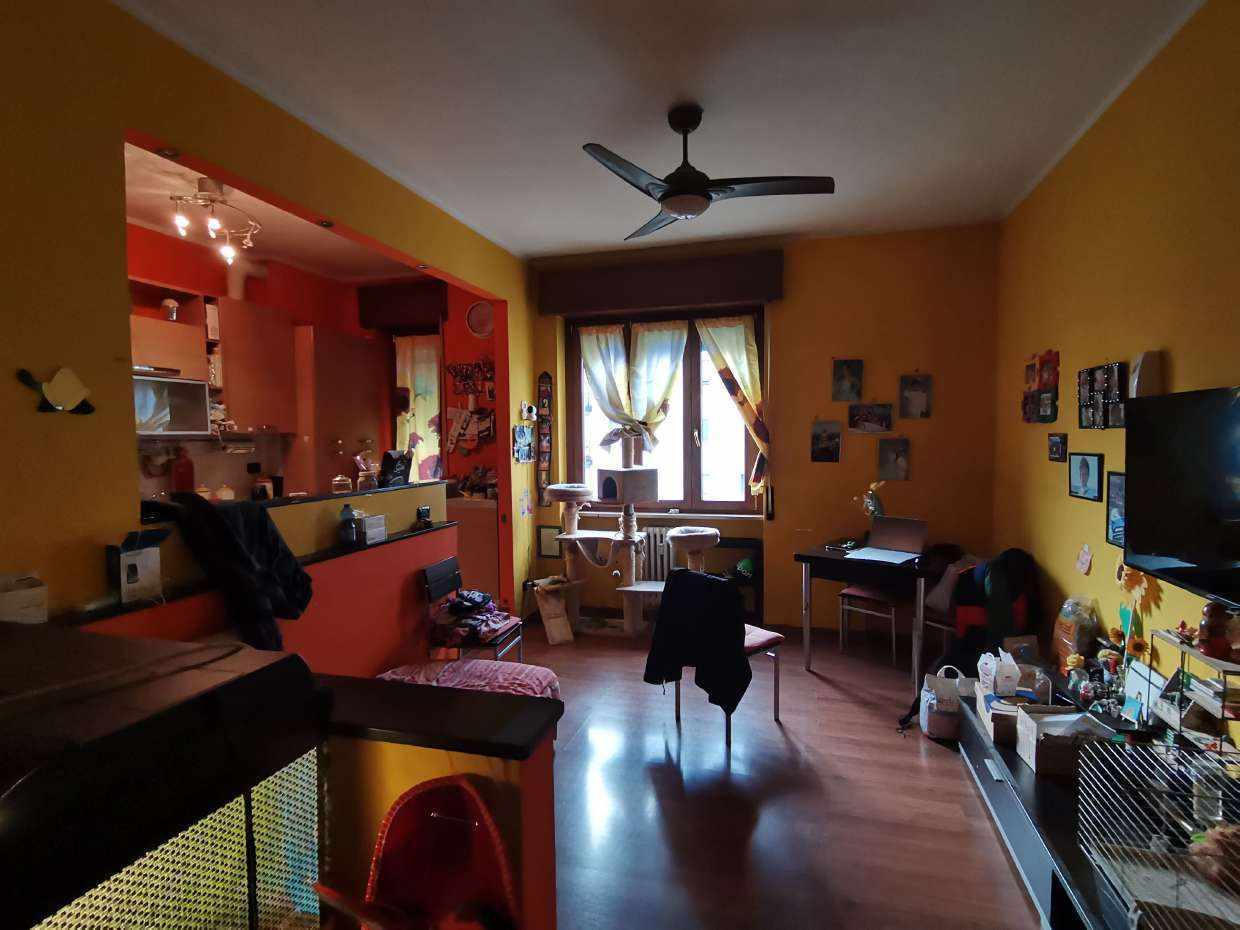 Appartamento della superficie commerciale di 83,71 mq posto al primo piano senza ascensore costituito da ingresso, soggiorno e angolo cottura, due camere, un bagno , due piccoli ripostigli e balconcino a servizio di una camera. Completano la proprietà una cantina ed un box la cui area di manovra (corte antistante l'ingresso) è ridotta pertanto non è possibile parcheggiare un'auto.