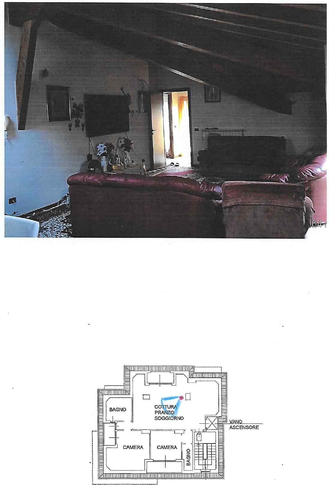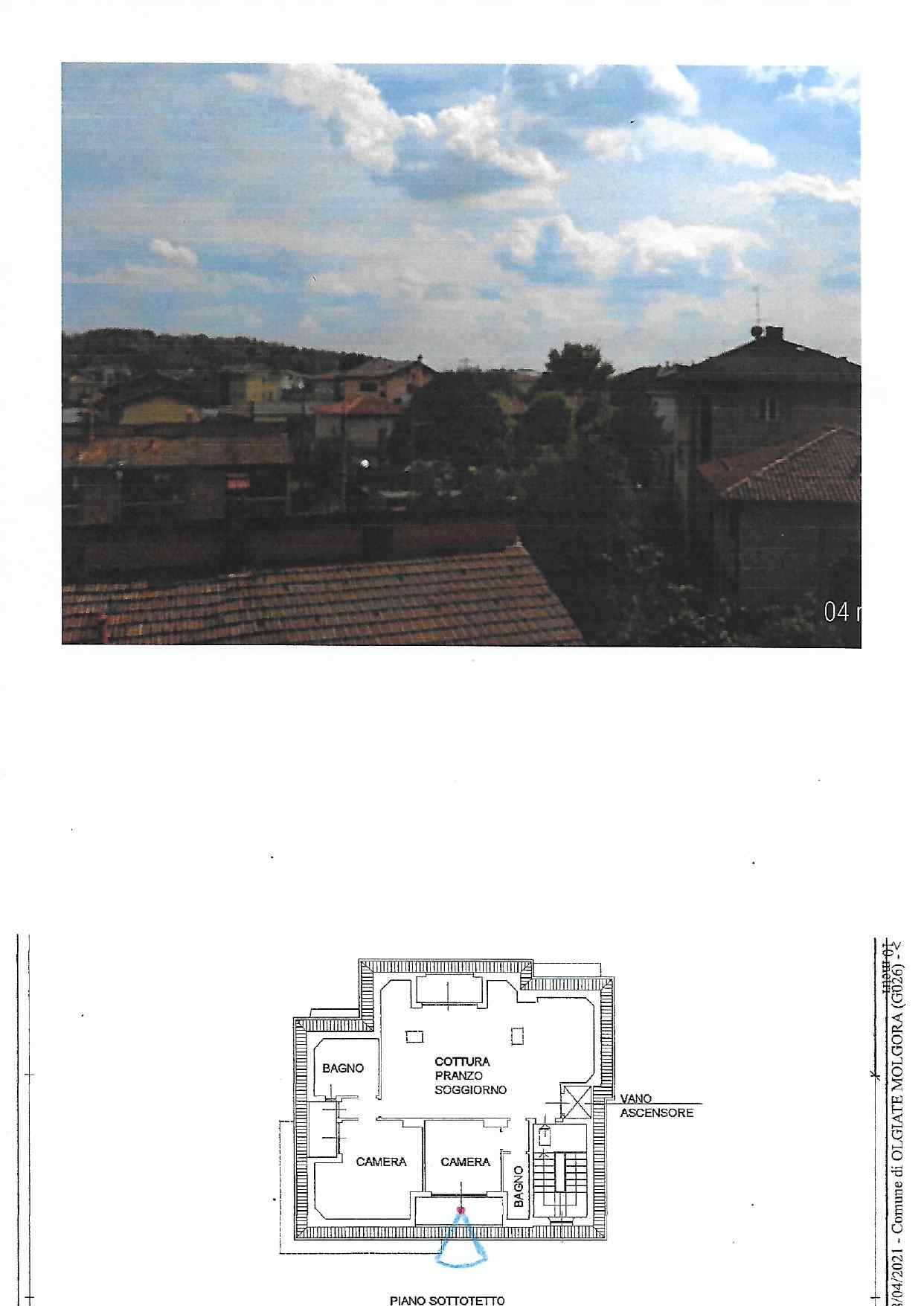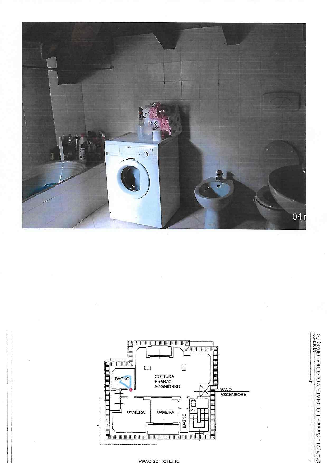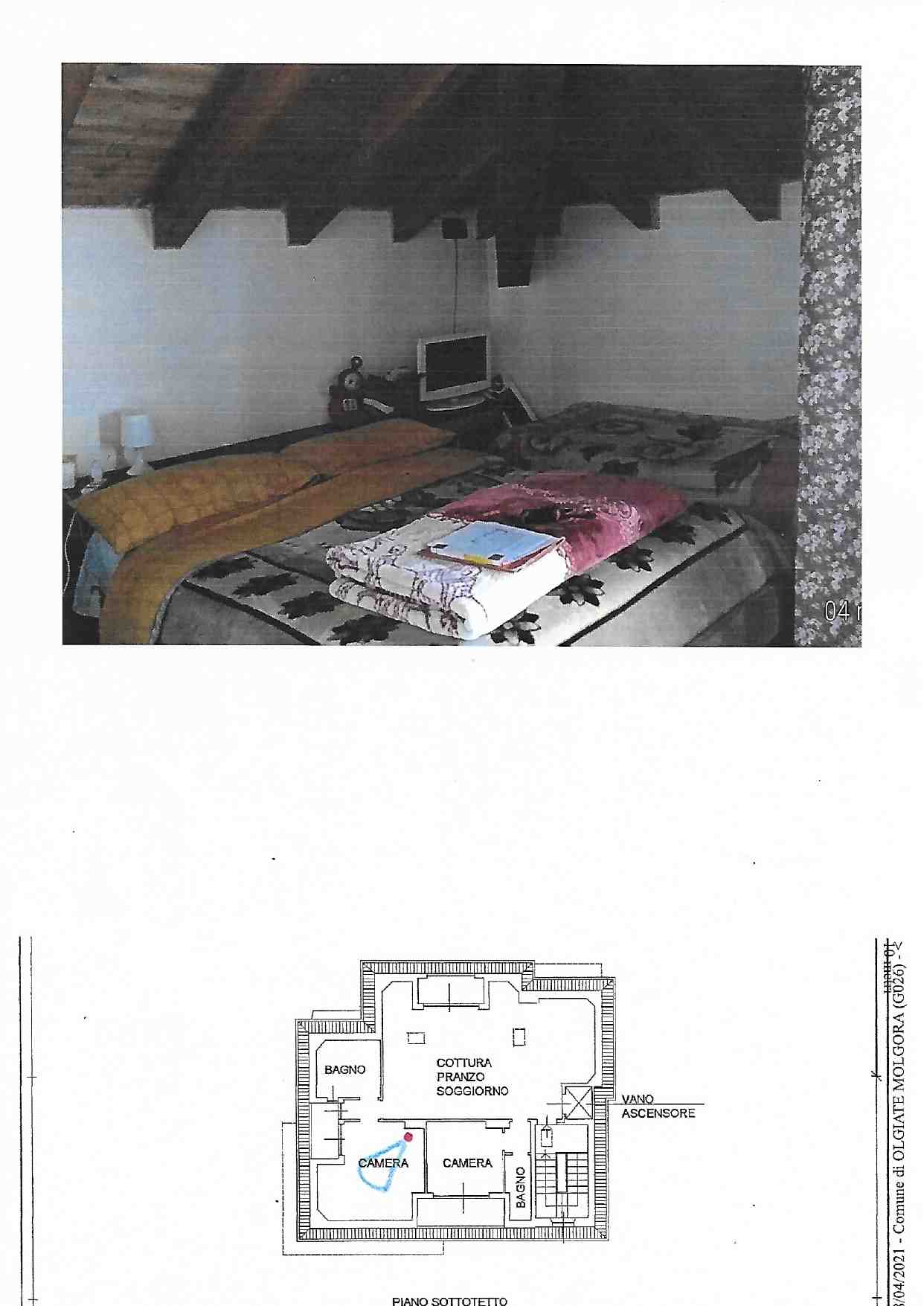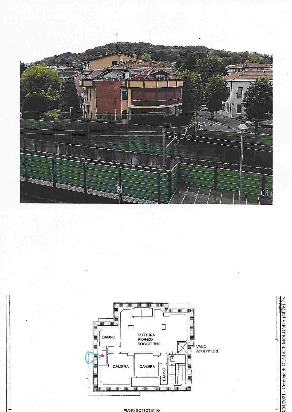 Piena Proprietà. In Comune di OLGIATE MOLGORA, nel fabbricato condominiale, composto da due corpi di fabbrica, alla via Ripesecche n. 3/A: appartamento al piano terzo/sottotetto, composto da cottura/soggiorno/pranzo con terrazzo, due camere ognuna con terrazzo e due bagni con relativi disimpegni; box singolo al piano terra e posto auto scoperto al piano terra.