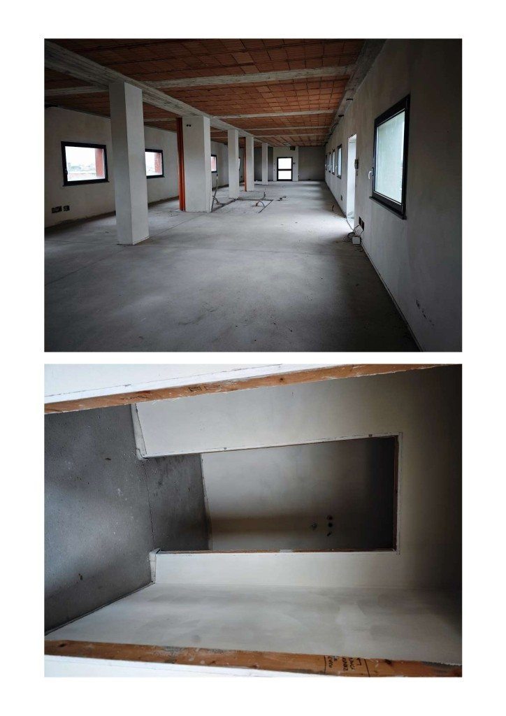 LOTTO N. 2 (DUE) a) unità immobiliare ad uso ufficio posta al quarto piano, composta da un unico ambiente open space L’unità risulta allo stato grezzo avanzato; sviluppa una superficie lorda complessiva di circa mq. 284,00 cui si aggiunge il ballatoio di circa mq. 26,00, sup. comm. Compl. di mq. 287. b) quota di comproprietà pari a 119,5/3.125 millesimi del manufatto relativo all’impianto di una cabina elettrica.