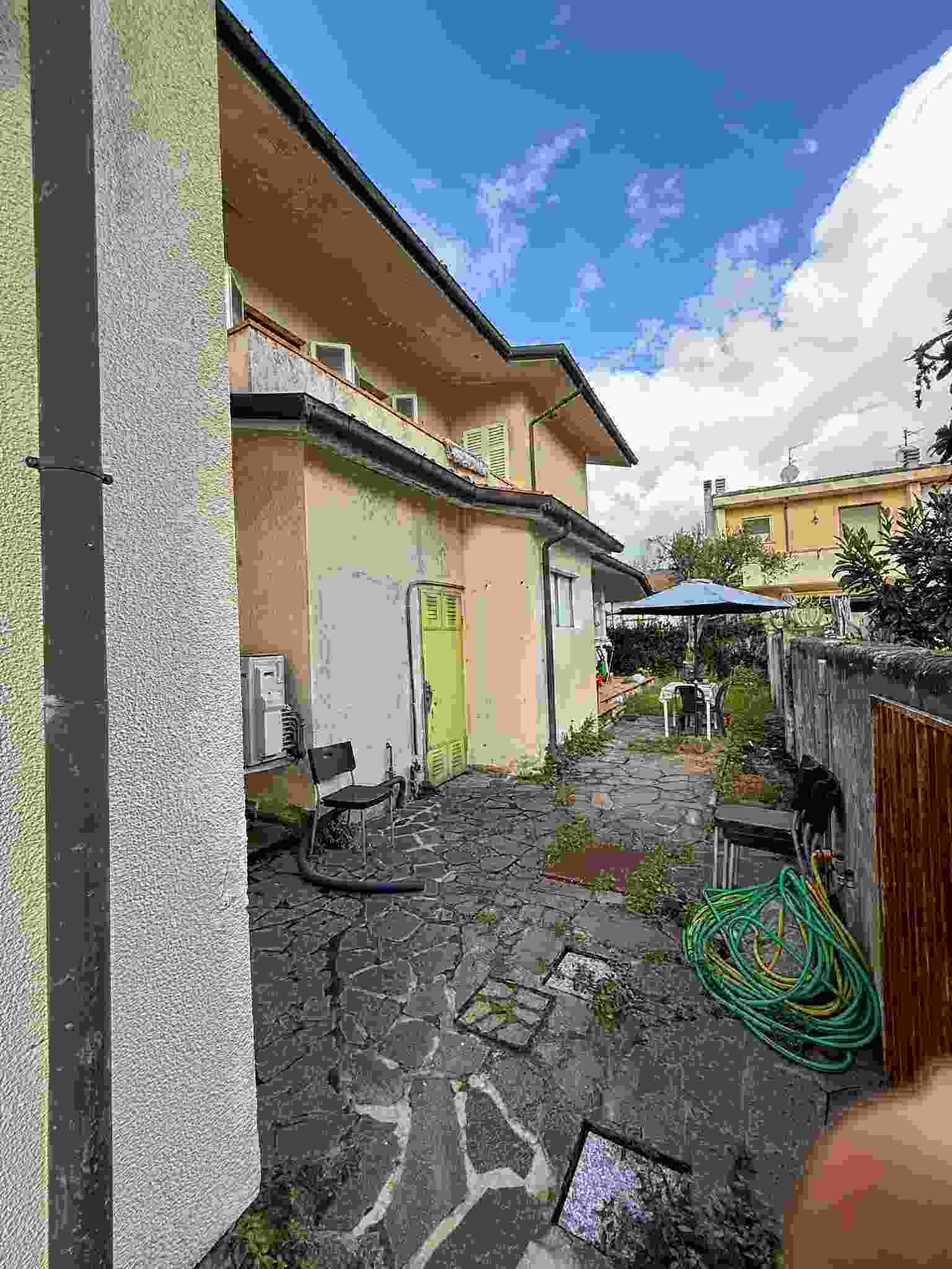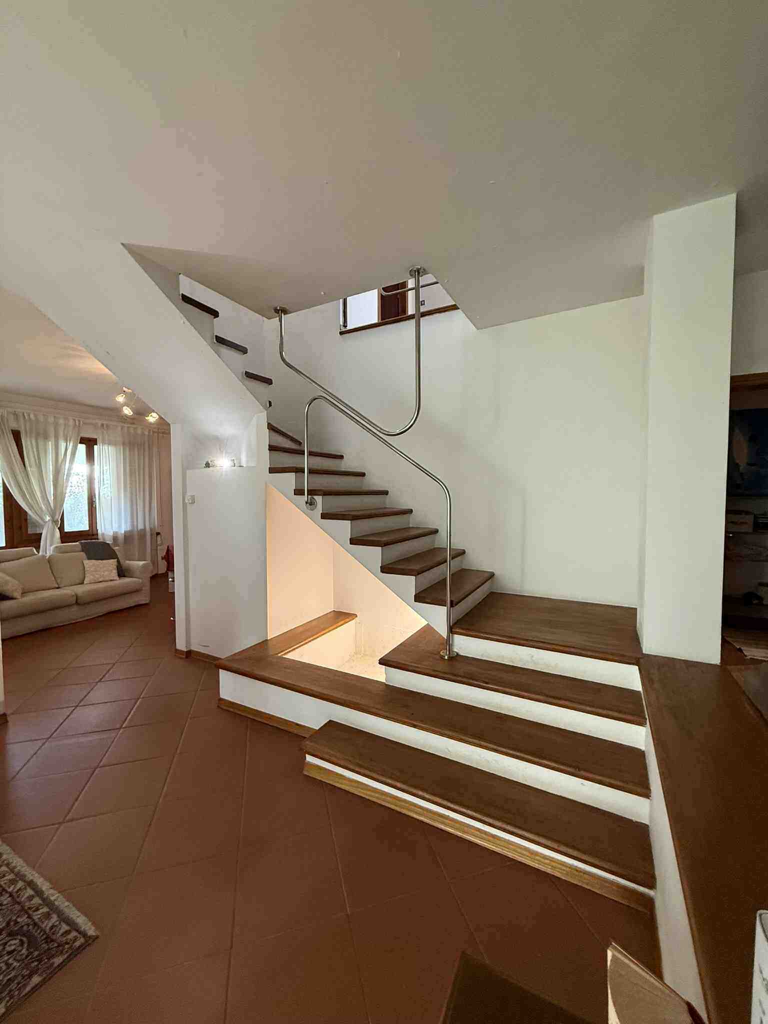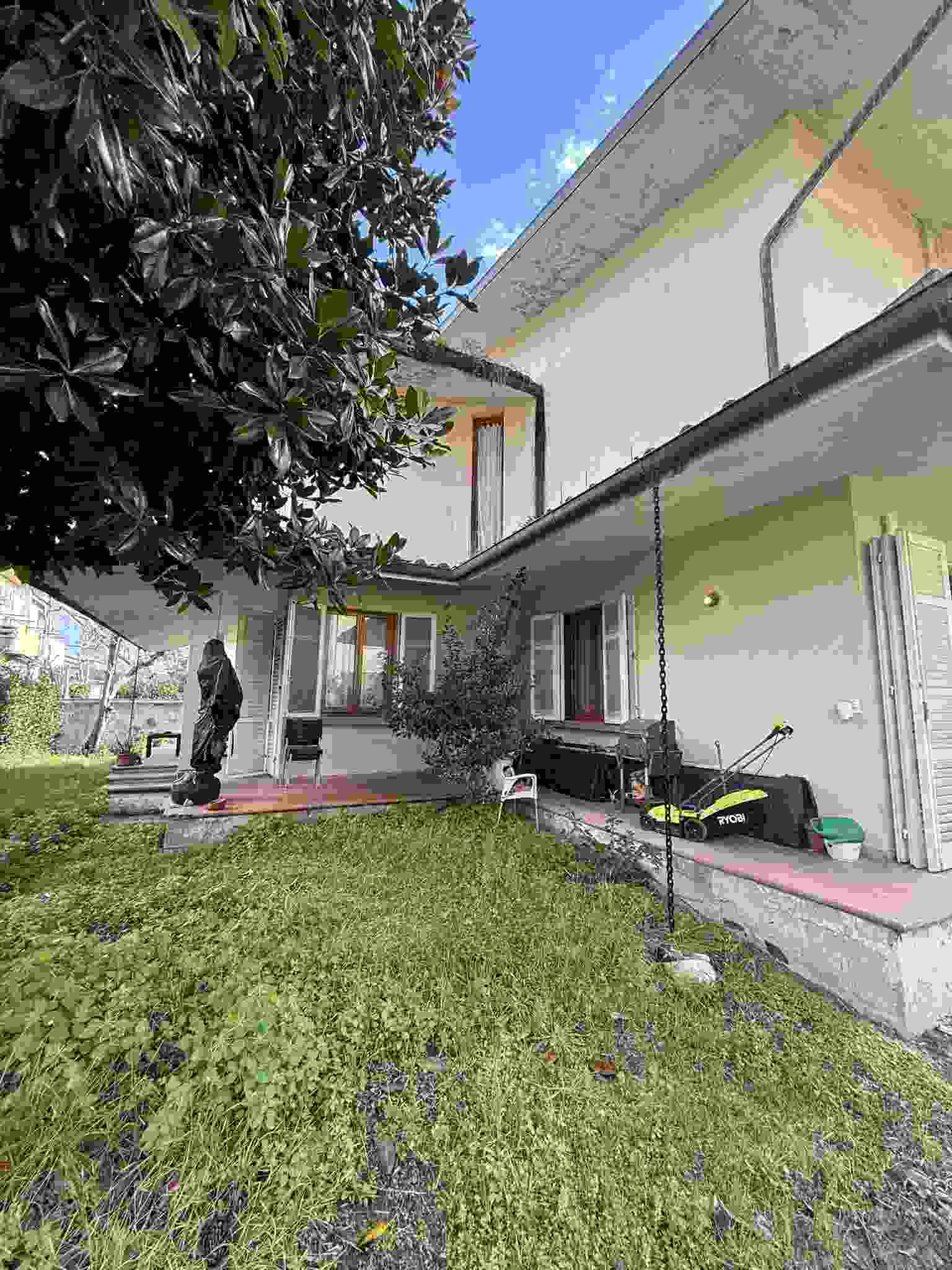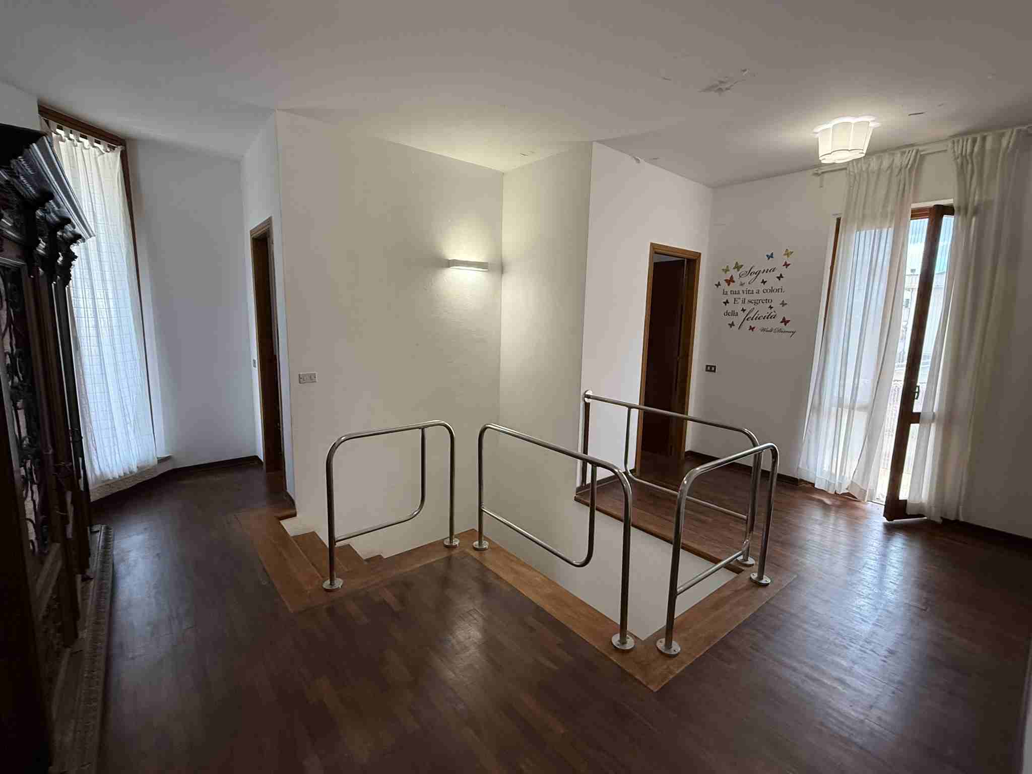 I diritti pari a 2/6 (due sesti) della piena proprietà su villetta bifamiliare elevata al piano terra, primo e seminterrato che si compone di: al piano terra di un'ampia zona giorno, con ingresso, soggiorno, sala con camino, pranzo e cucina abitabile, un bagno con antibagno e scala che conduce alla zona notte composta da tre camere, un ampio bagno e due balconi, è circondata da marciapiede esterno in cotto e da resede su tre lati parte inerbita e parte pavimentata con porfido posato ad "opus incertum".