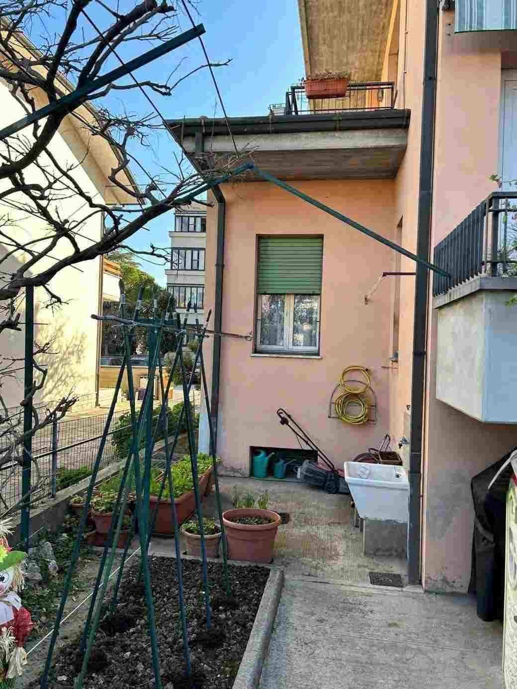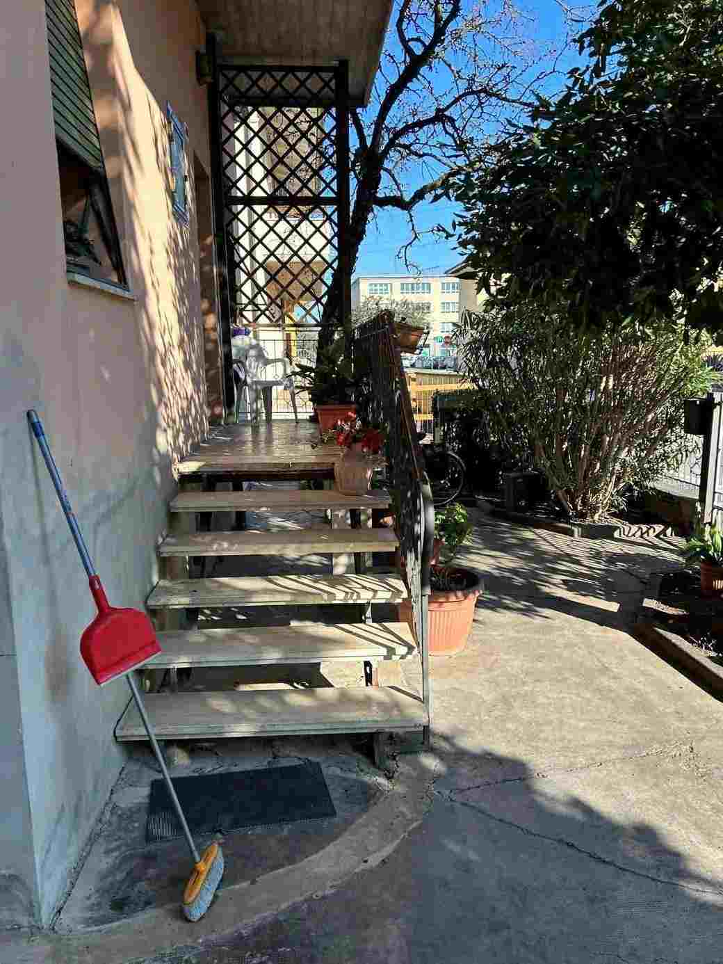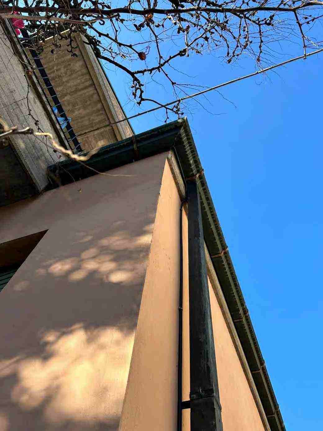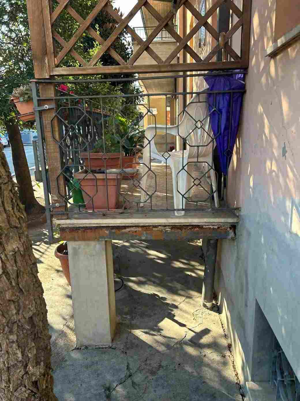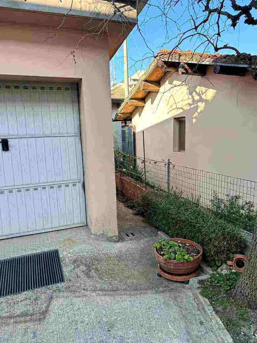 1/1 di porzioni immobiliari facenti parte di fabbricato bifamiliare costituite da appartamento al piano rialzato, accessibile tramite scala esterna e ballatoio, in pessimo stato di conservazione, con annessi vani ad uso cantina e lavanderia al piano primo sottostrada, due vani ad uso garage e un vano ad uso sgombero in corpo di fabbrica staccato edificato sulla corte comune. Superficie commerciale tot. mq. 122,39. Occupato da uno dei condividenti.