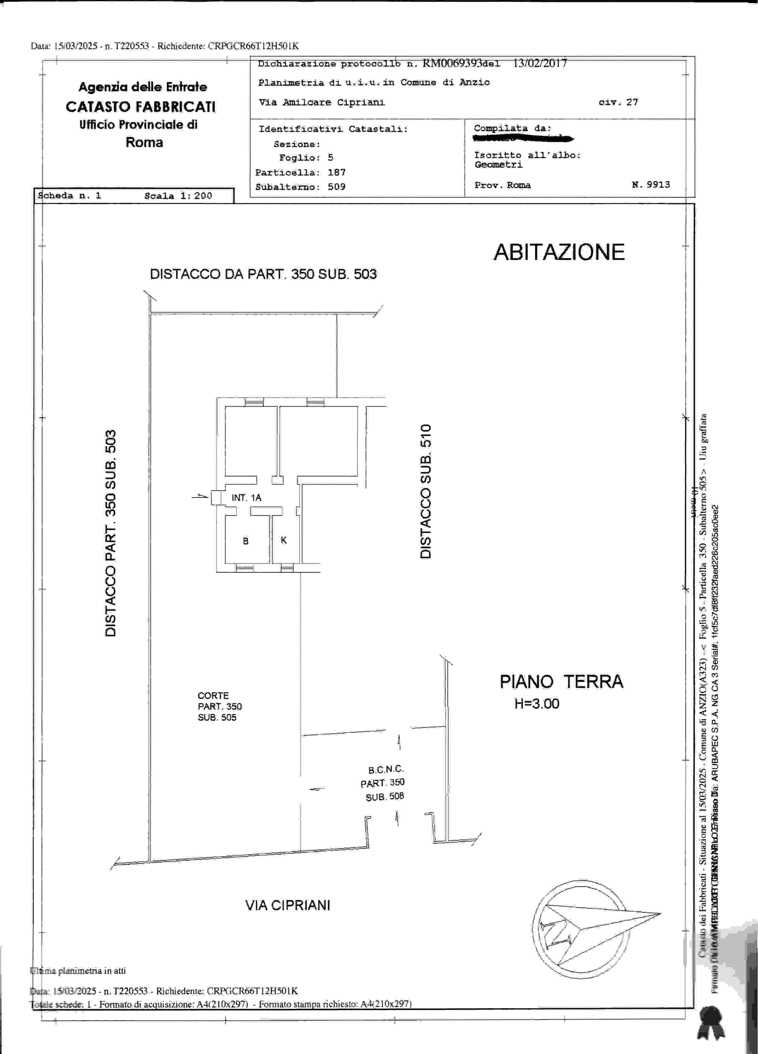 L’immobile si sviluppa su un unico livello-piano terra e risulta composta da ingresso/disimpegno, soggiorno, cucina, bagno e camera da letto con annessa area cortilizia di uso esclusivo, identificato in Catasto Fabbricati foglio 5, part. 350-187, sub 509, cat A 3, graffato 505. Superficie convenzionale 123,04mq tra interno esterno.