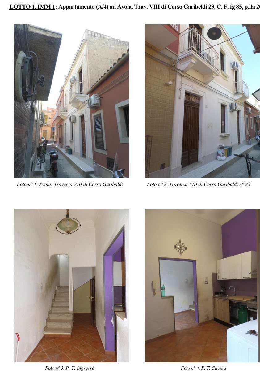 Piena proprietà di Abitazione (A/4) ad Avola, Trav. VIII di Corso Garibaldi 23. C. F. fg 85, p.lla 207 Abitazione sita nel Comune di Avola, Traversa Ottava di Corso Giuseppe Garibaldi n° 23, piano terra, primo e secondo, censita nel Catasto Fabbricati del Comune di Avola al foglio 85, p.lla 207 (ex particella 207, sub 1 e sub 2), zona censuaria 2, categoria A/4, classe 2, vani 5, superficie catastale totale 104 mq, superficie escluse aree scoperte 98 mq, rendita Euro 211,75