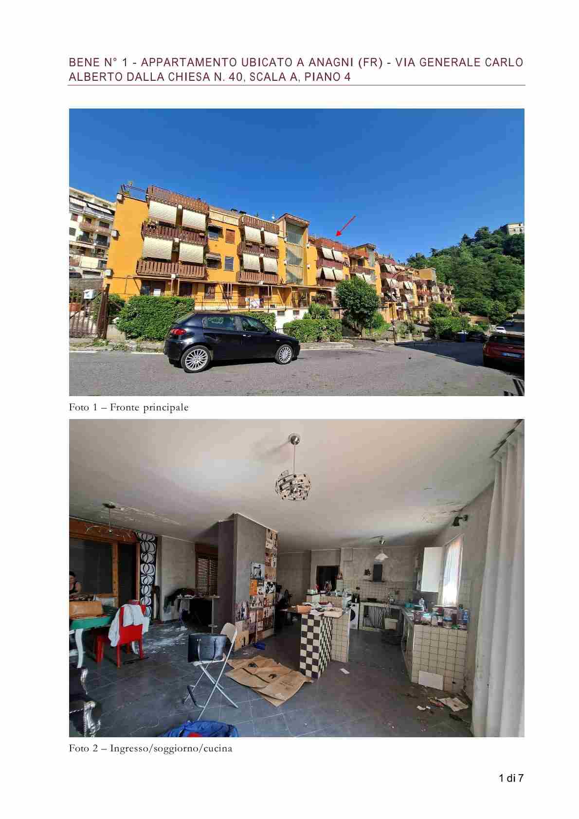 Diritto di proprietà (1/1) dell'appartamento ubicato in Anagni (FR) - via Generale Carlo Alberto dalla Chiesa n. 40, scala A, piano quarto. Trattasi di appartamento distinto al N.C.E.U. nel FOGLIO 50 PART. 181 SUB. 31, categoria A2, ubicato all'ultimo piano di un fabbricato residenziale sviluppato su quattro livelli. Completa la proprietà una cantina ubicata al piano primo distinta dal SUB. 19 – BENE N°2 - ed un garage distinto al SUB. 12 - BENE N° 3 - ubicato al piano terra/seminterrato.